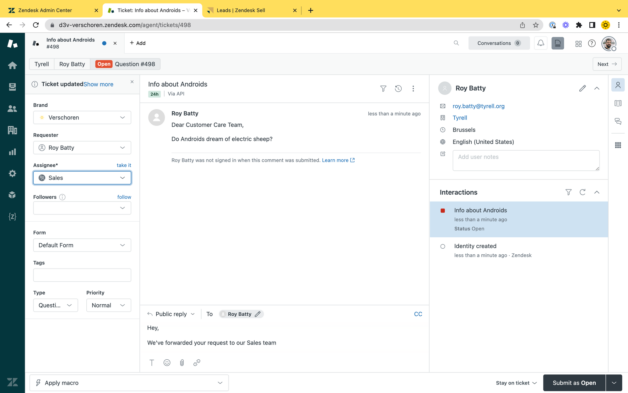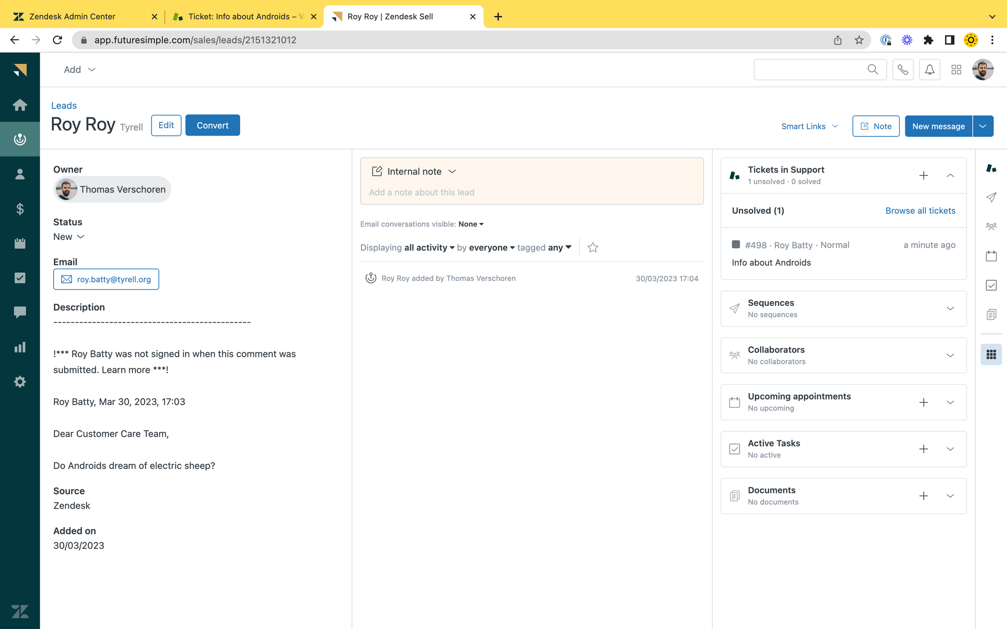 And, if all goes well, each time we now assign a ticket to sales, the ticket will be resolved, and a new lead will show up in Zendesk Sell.