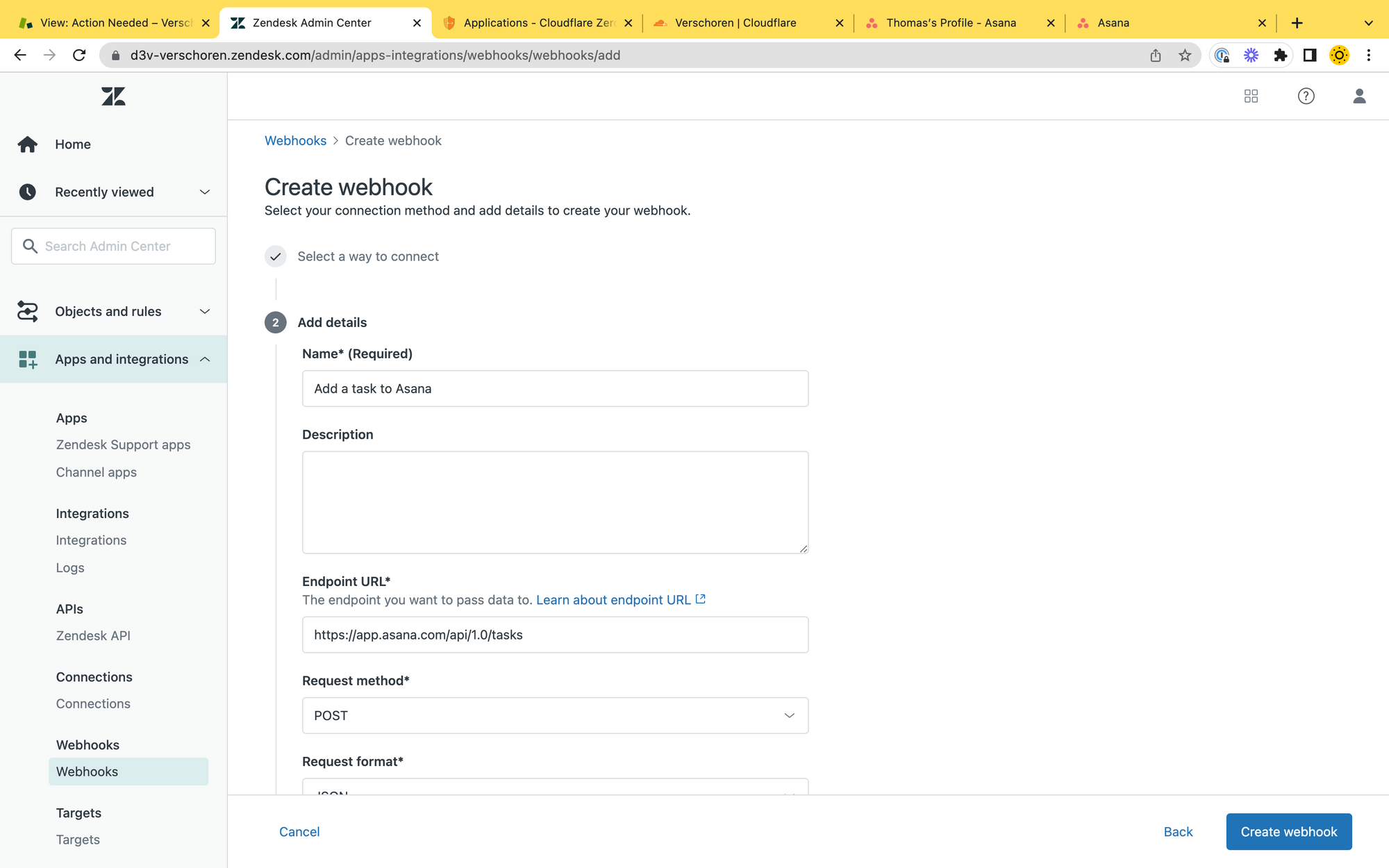 First off we create a new webhook that calls the ttps://app.asana.com/api/1.0/tasks endpoint.