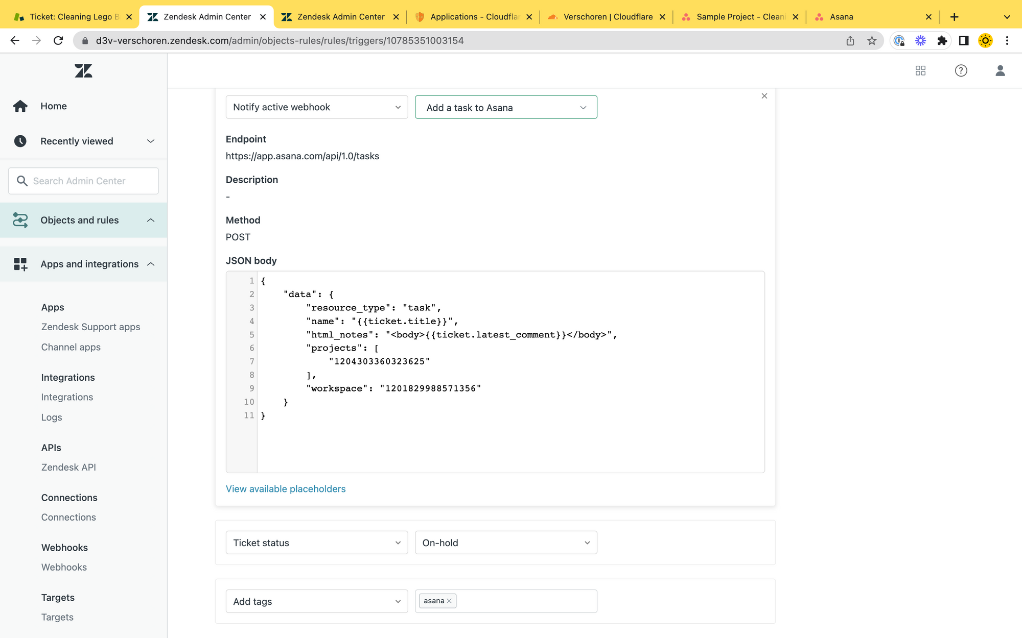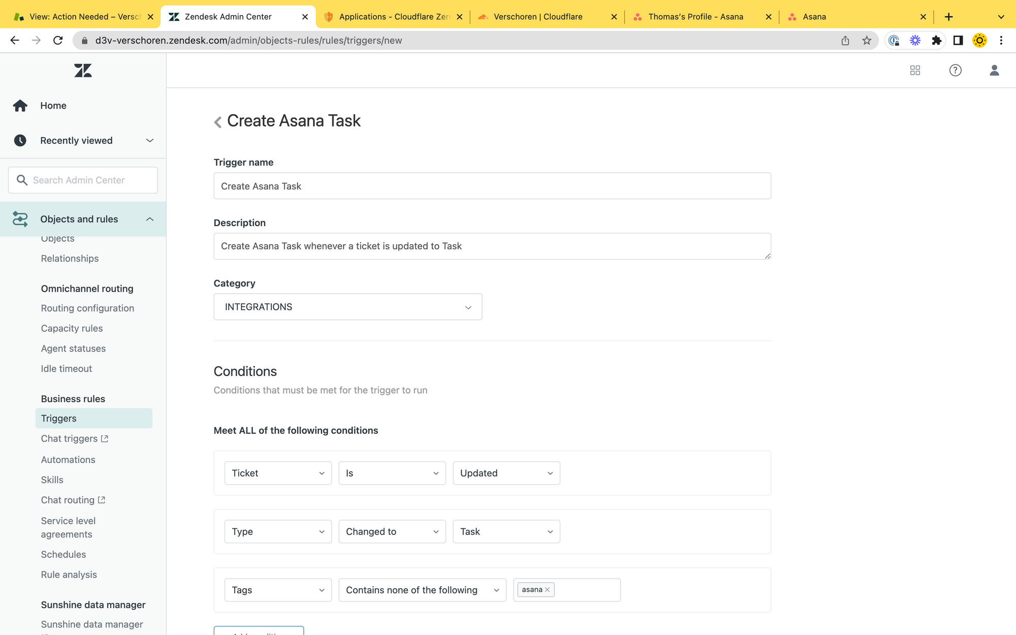 So far, that's two out of three issues resolved. Let's check the final one, Asana. In this example we're going to create a new task in Asana whenever a ticket is updated and the ticket type is changed to, you guessed it, Task.