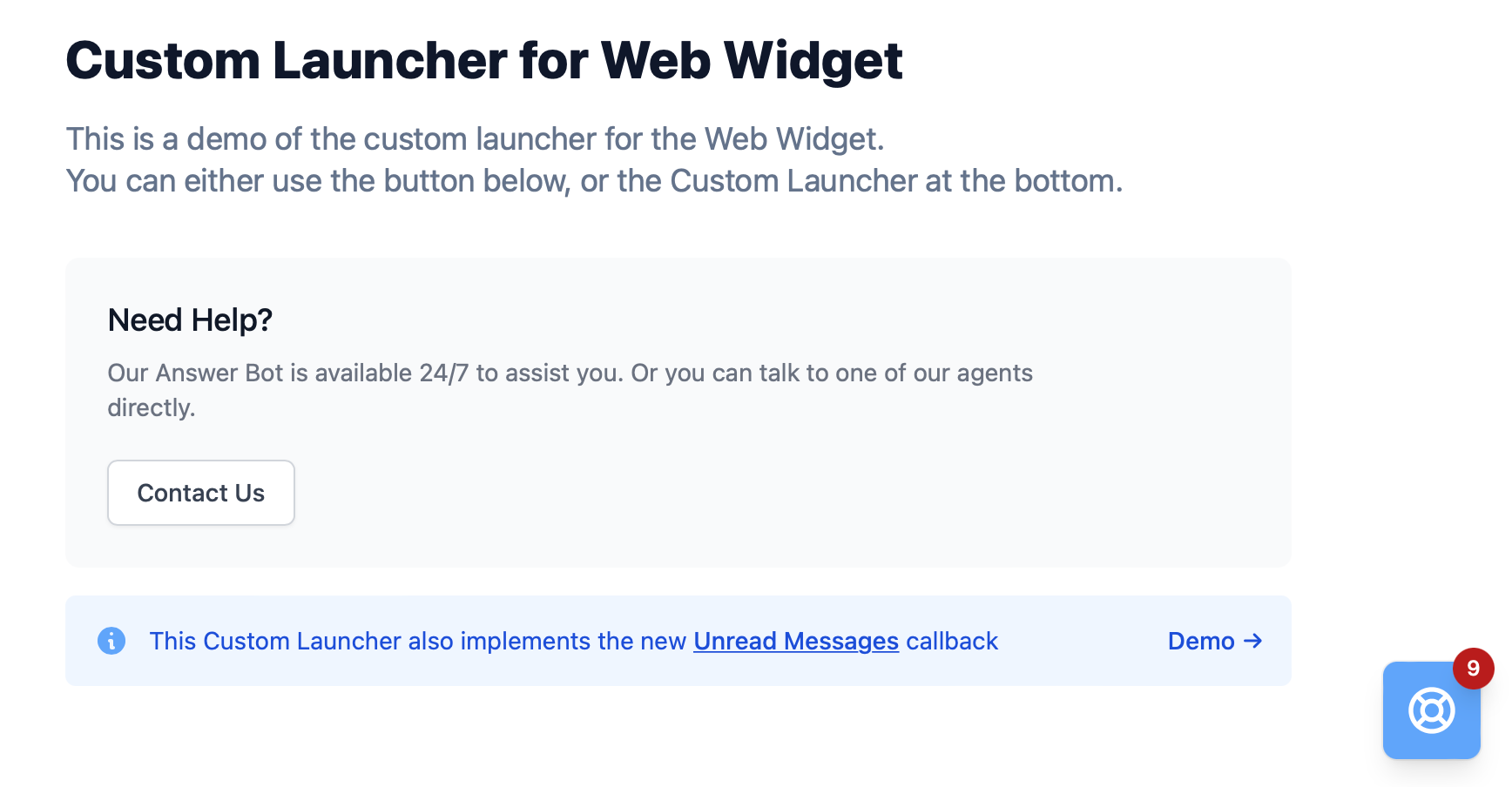 It allows you to launch the Messaging Widget via a Contact Us button on the middle of the page, or (better) use a custom designed launcher button to open the Messaging Widget.