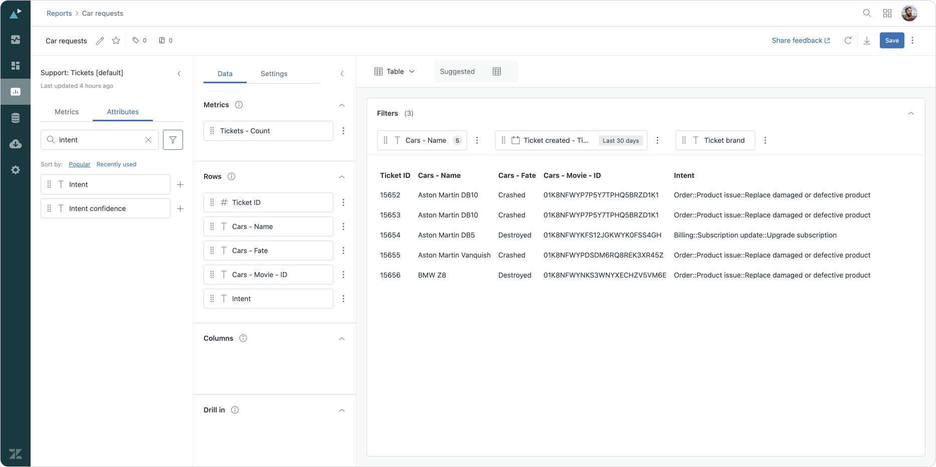 Within Explore we now have support for Custom Objects and the object fields within a record. We can create a report that shows all our tickets, and not only show the chosen record, but also include any other linked values.