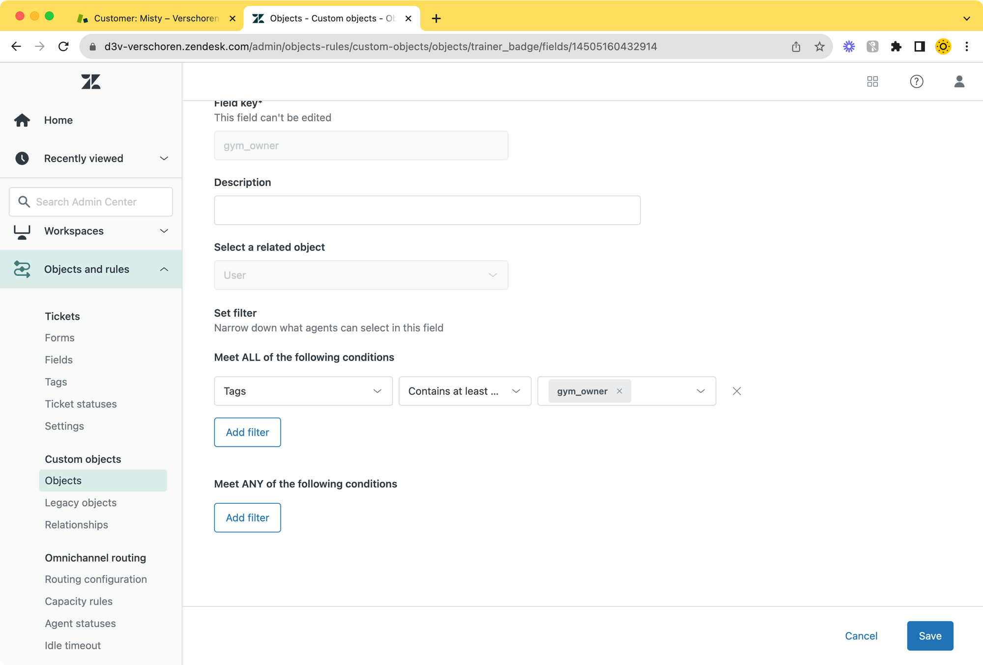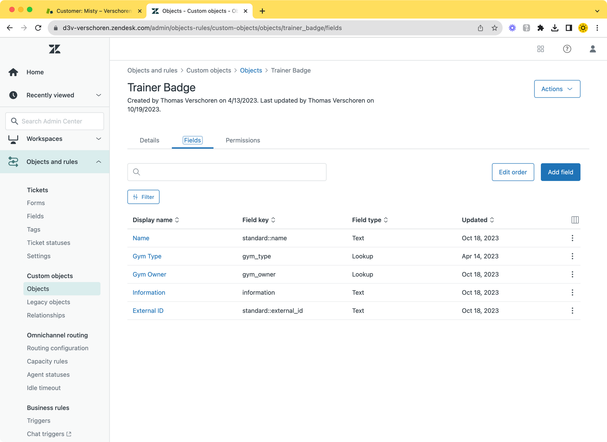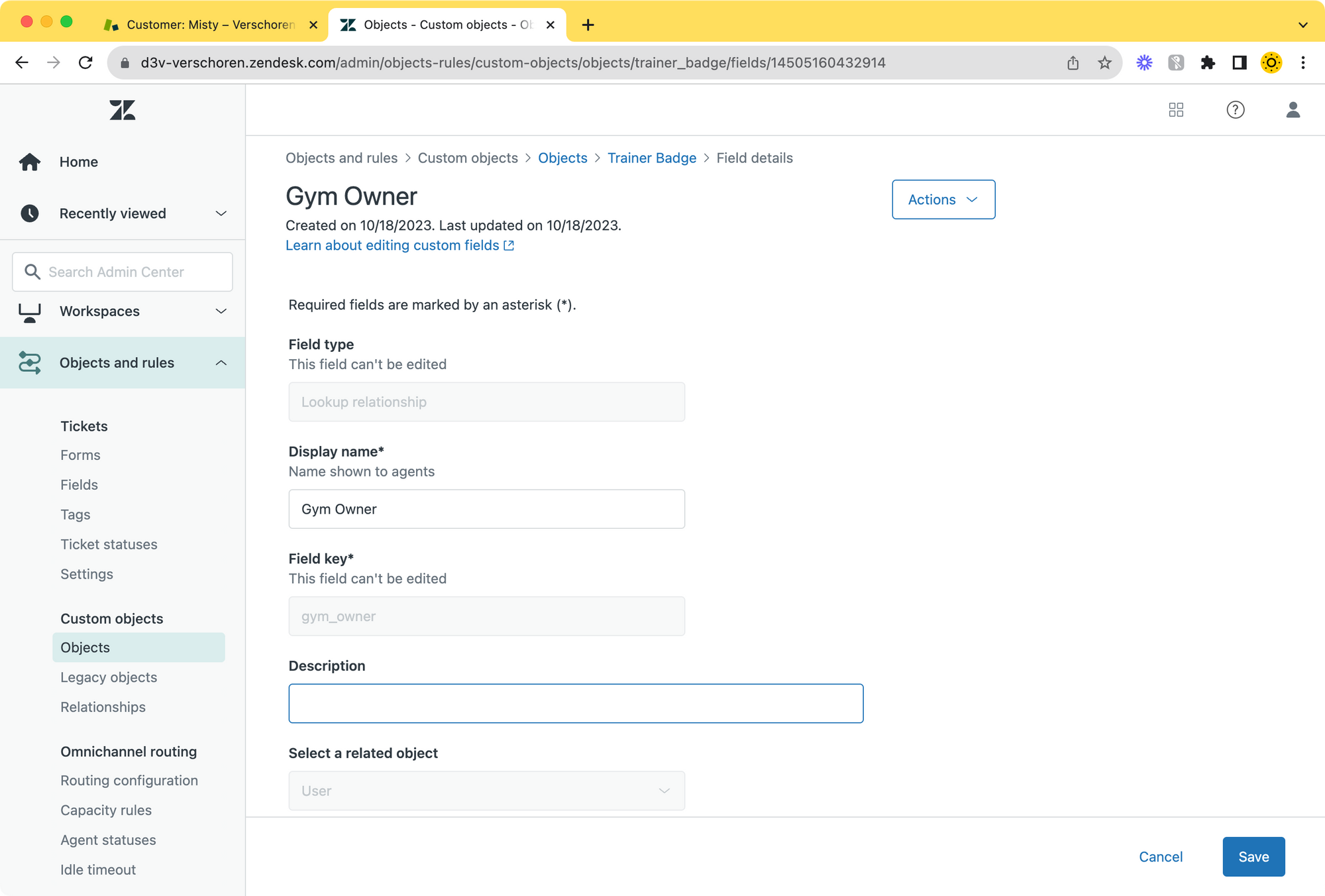 userin our Zendesk environment - Gym Type: Lookup Field linked to the Custom Object