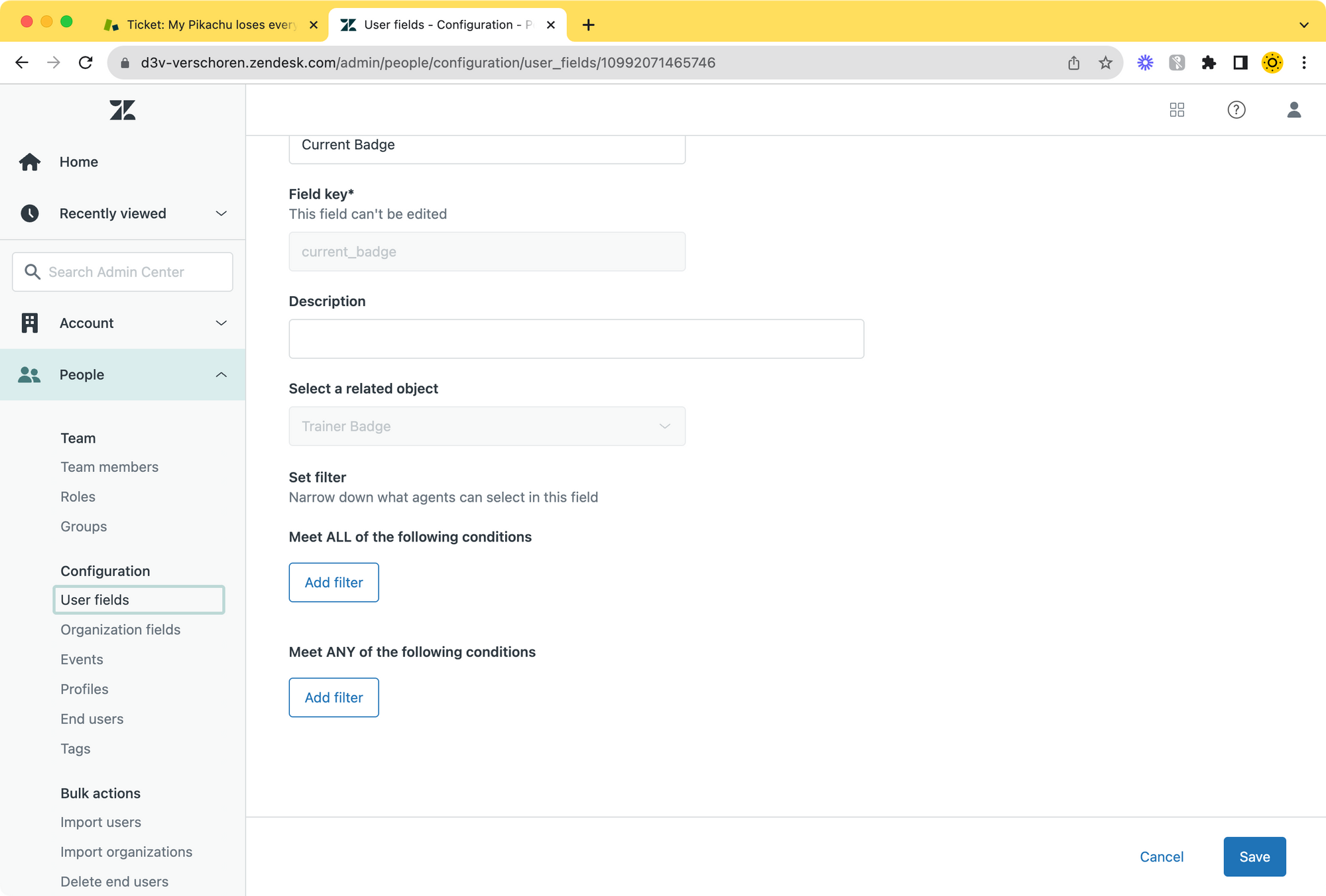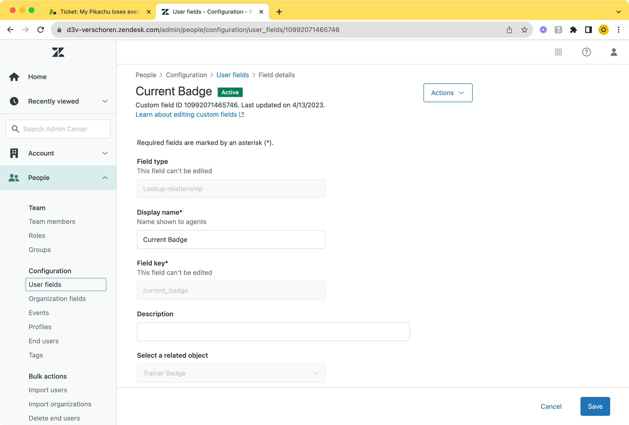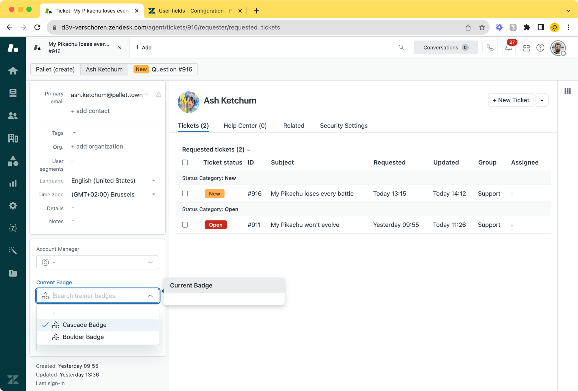 Now, when we open a user profile in Zendesk, a new user field will appear on the left side. Click on the Badge dropdown and select the Cascade Badge we just created.