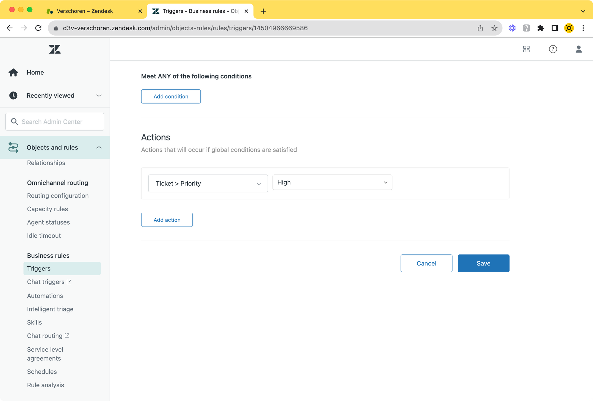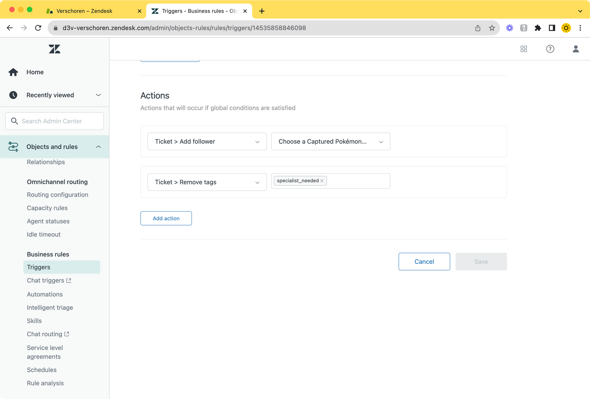We can now create a trigger that adds the Gym Owner as a follower whenever the tag specialist_needed is added to a ticket. This is done by leveraging the nested data in a Custom Object.