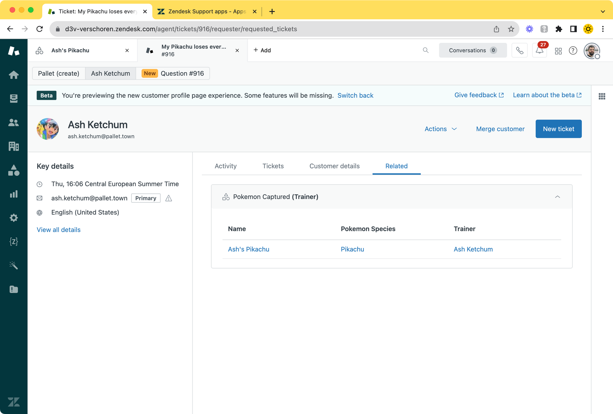 Once added, the Pokémon will show up when looking at the Captured Pokémon object, and will also show up on the Trainers profile in Zendesk in the Related tab.