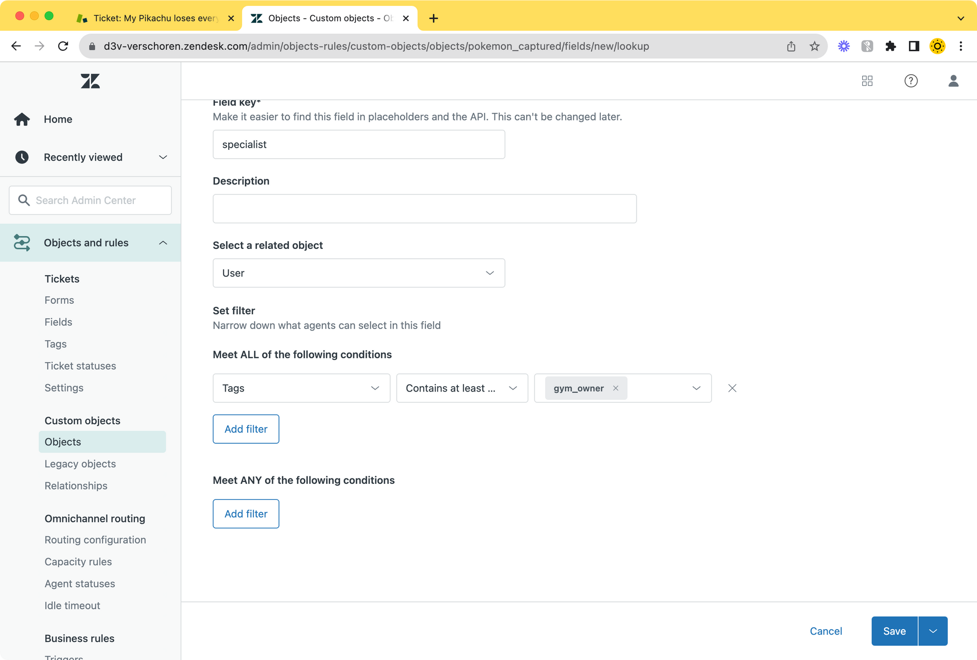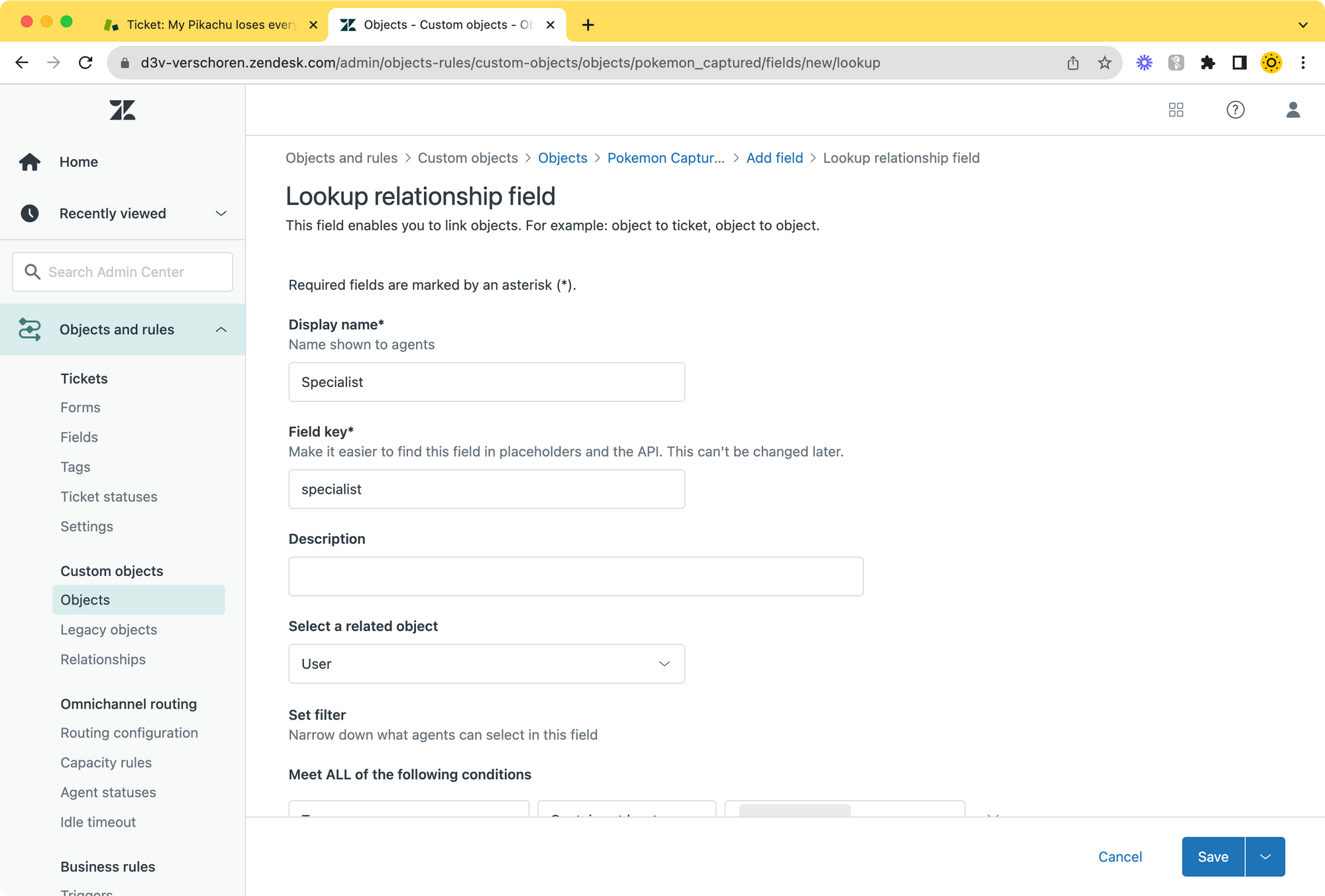 This is done similar to how we did it earlier for the regular object. Create a new Custom Ticket Field of type Lookup Relationship, and select the Captured Pokemon as a related object.
