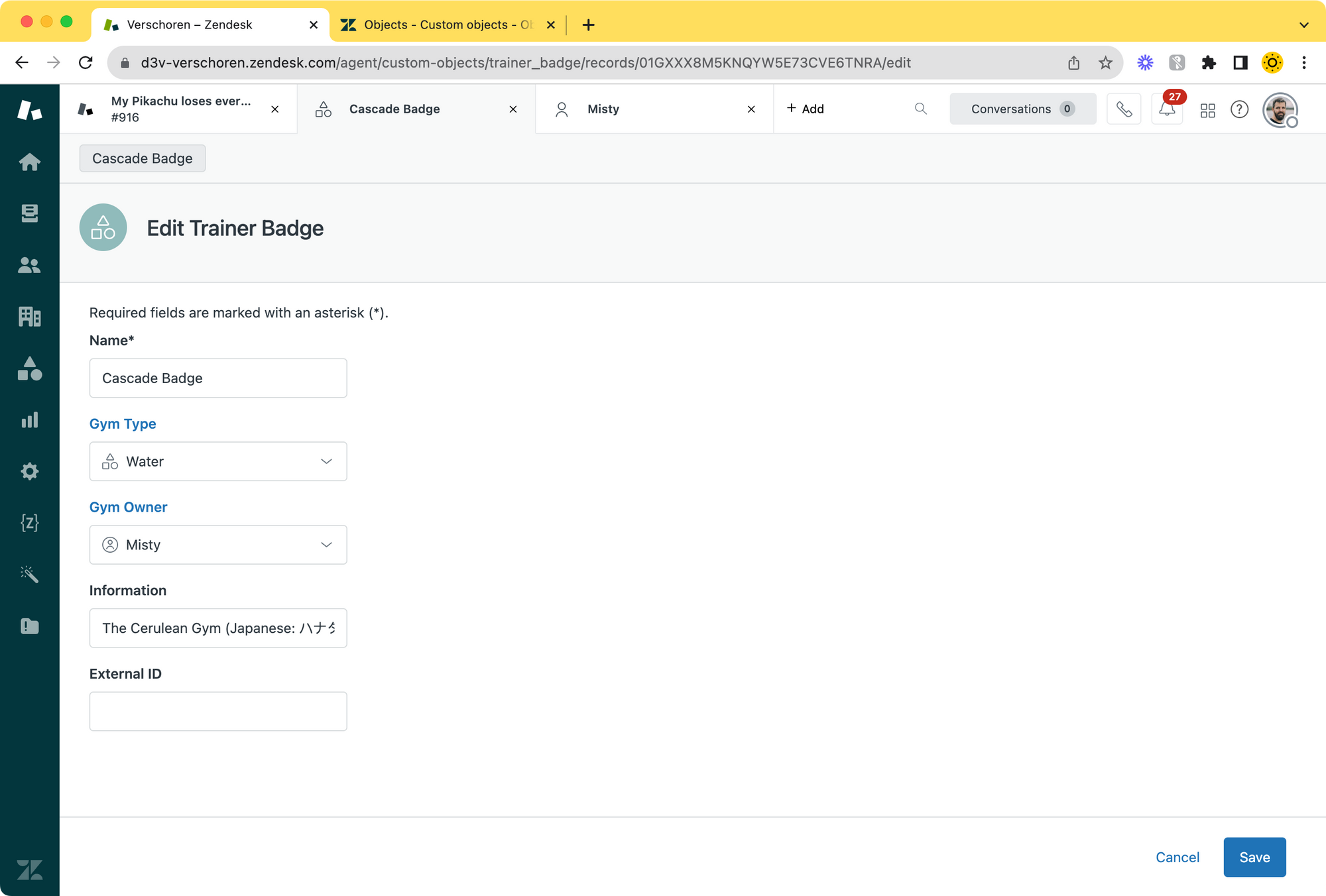 Now that we've created the record type, we can start adding records to our object. We'll create a Cascade Badge, of type Water linked to the Gym Owner Misty.