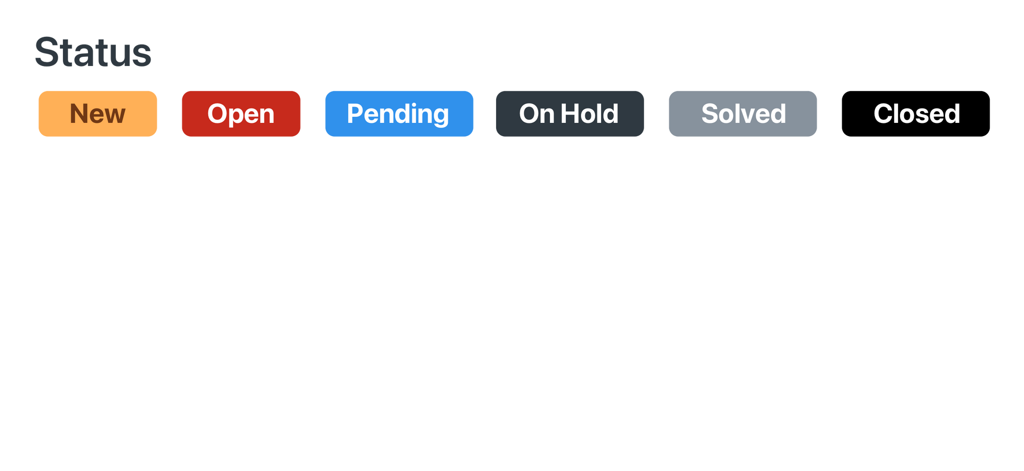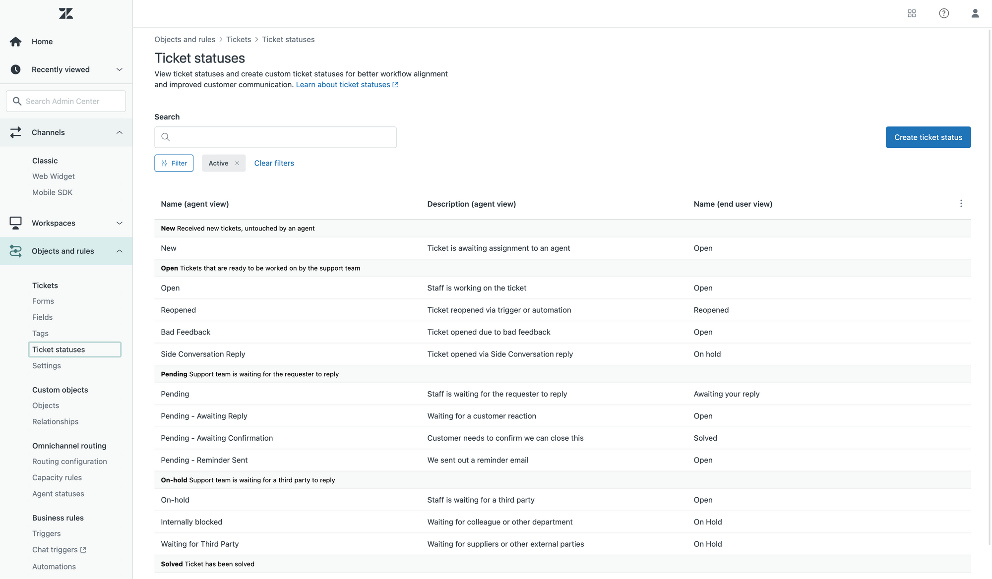 - Default Zendesk statuses have a {{zd.status}} label and can’t be disabled