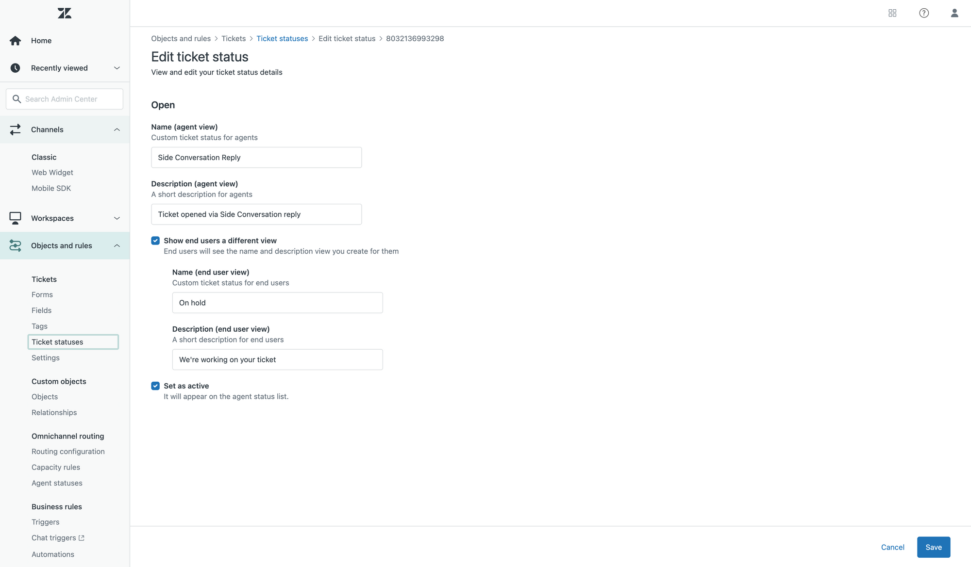 status_categorydenotes the parent category of your Custom Status.- Statuses can have both an agent and customer facing label and description.
