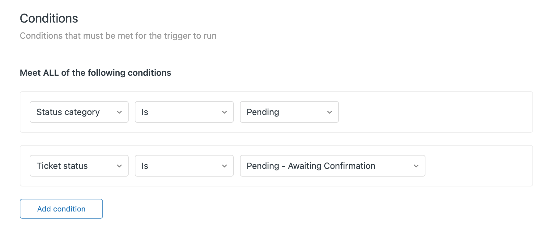 All those settings now also refer to a Custom Status condition. That one contains all new custom statuses. By default custom statuses contain six Zendesk statuses but you can (and should) add your own.
