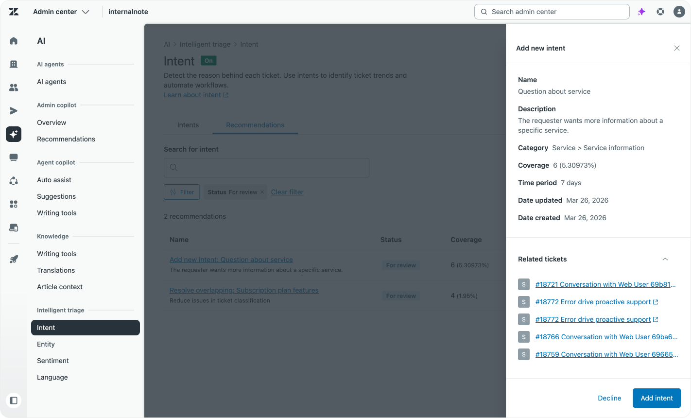 The Intent Recommendations feature, part of Agent Copilot, solves this issue by continuously looking at your intents and tickets.