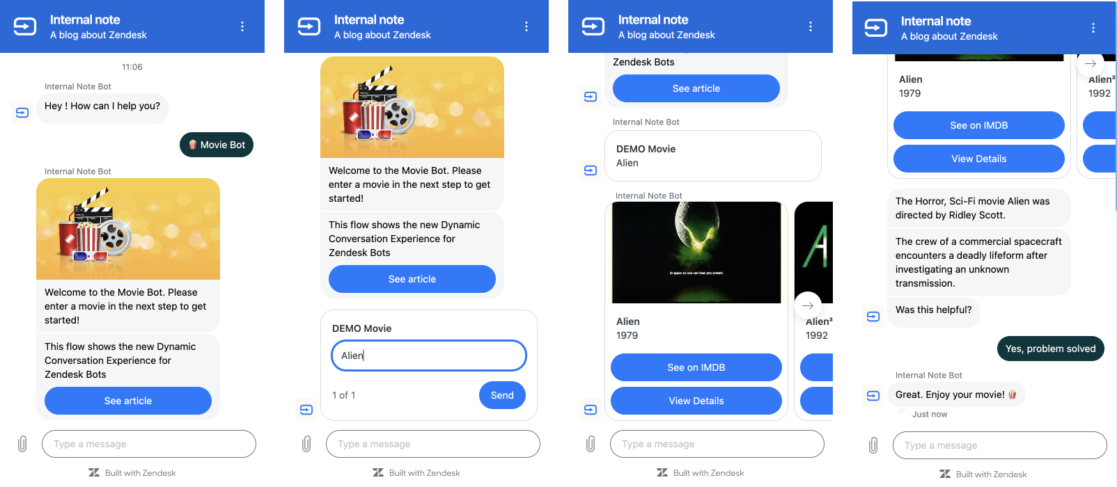 This article will showcase the new Dynamic Conversation features for the Zendesk Bot by building a Movie Bot that shows information about movies to your customers
