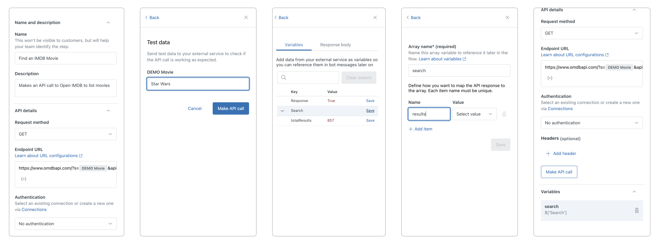 You can then use the Make API Call button to test the API call. If successful, you'll get a list of variables. Save the Search Array and give it a name like results. This variable will contain a list of results, and can be one, two or (any) length.