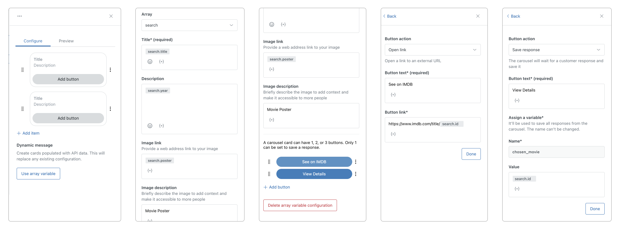 - We use a Carousel step to show a list of search results, and use variables to set images, buttons and content