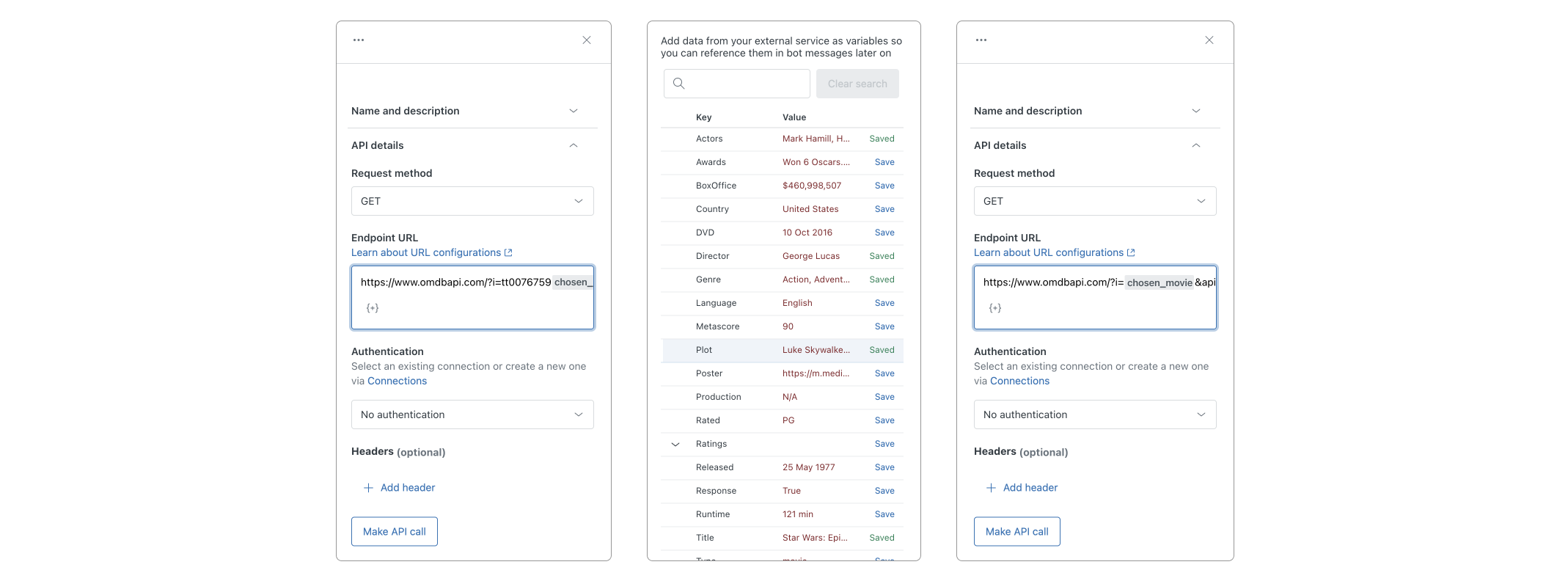 Use https://www.omdbapi.com/?i=&apikey=abcd1234 as the endpoint and use the {+} button to add chosen_movie as a parameter after the ?I= part of the URL. This will make our API request dynamic by referencing the earlier customer choice.