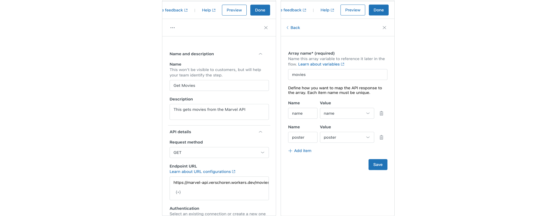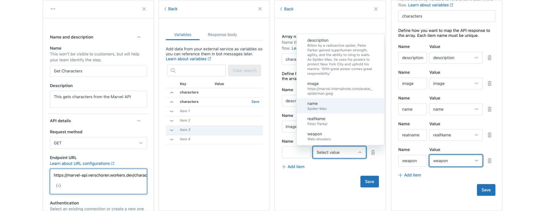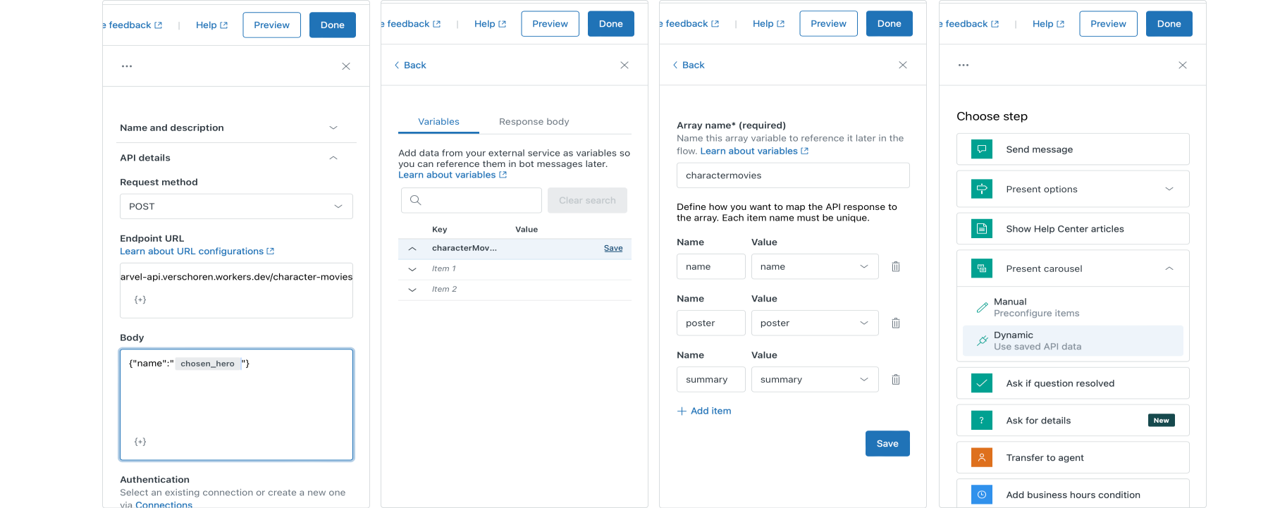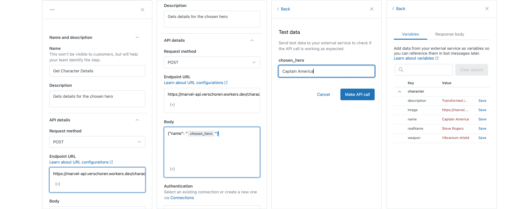 chosen_hero value comes from since we haven't used it in the Movies flow at all. However, if a customer first hits the Character flow, and we then connect them to our Movies flow, this value is set with the name of their favorite hero, thus making the conditional branch choose the else flow.The steps here are almost identical to those of all previous API calls.