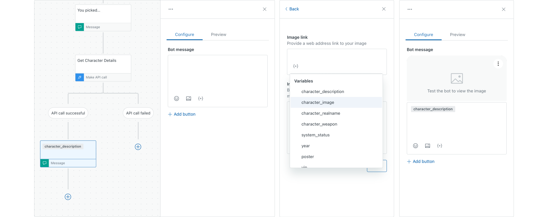 charactersarray and add a Bot Message. - For the Option text choose the