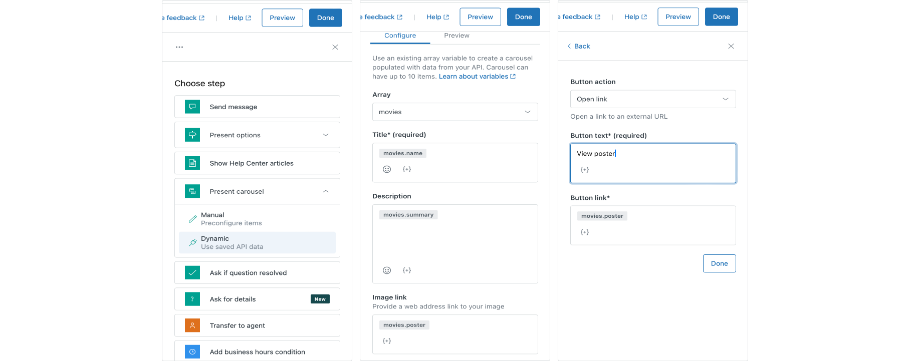 When Zendesk introduced their Dynamic Conversation experience late last year, one of the nice additions was the ability to generate carousels based on API data. I used it to generate a carousel of movies in my demo for example.