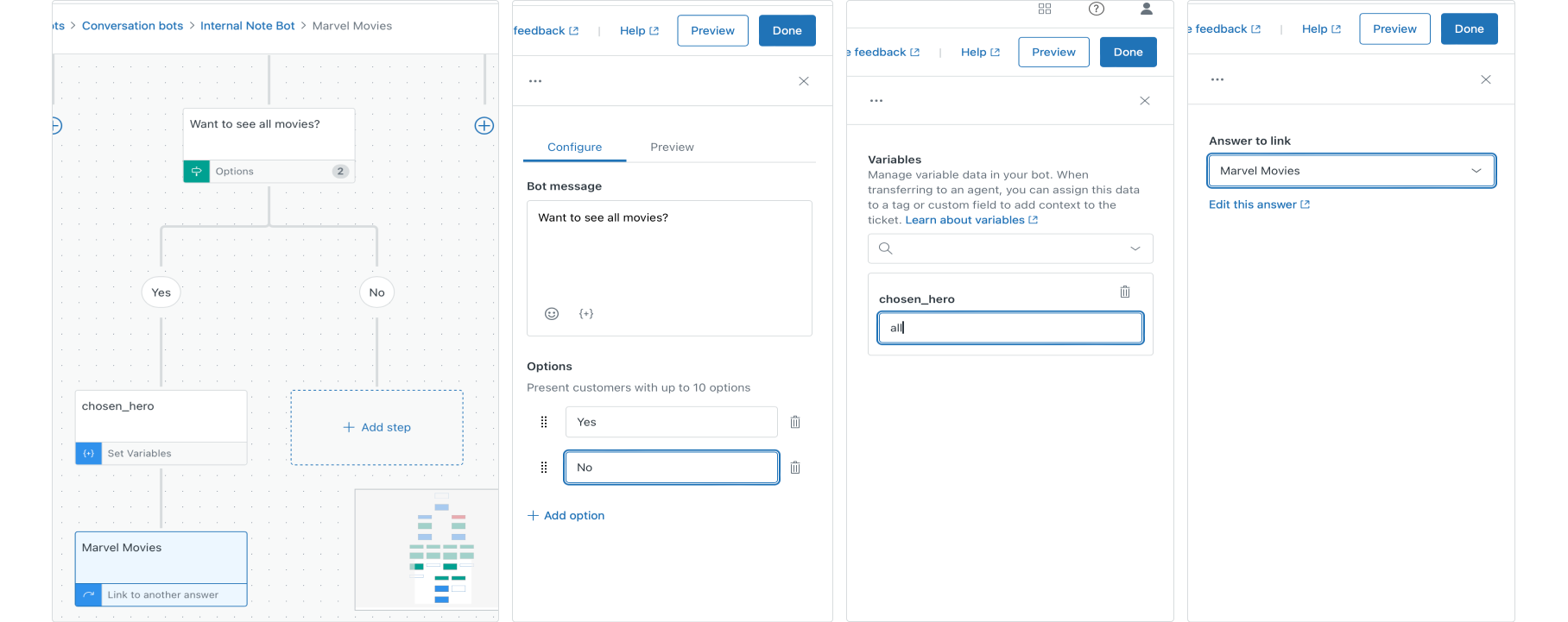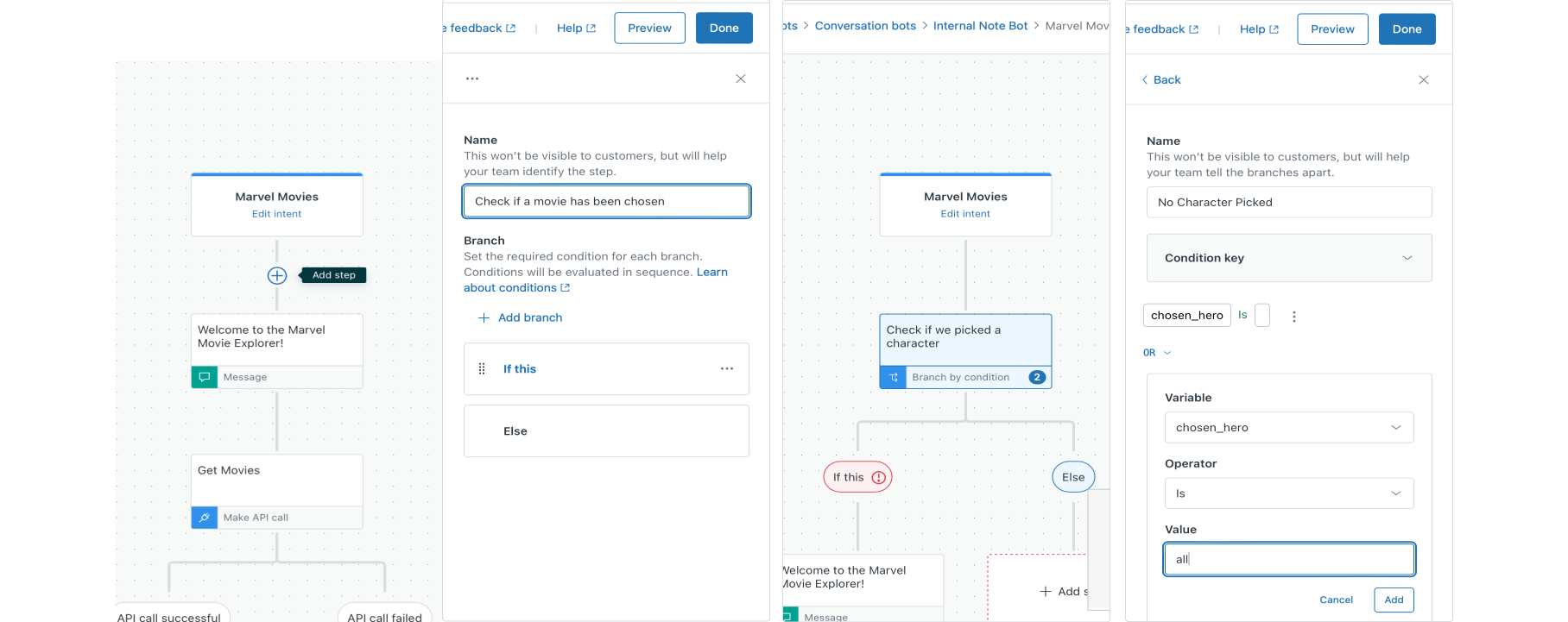 What happens now is that, when a customer says 'Yes I want to discover all movies', we set the variable chosen_hero to all and start our flow from the top via the linked answer. This time, instead of chasing the else branch, we've met the conditions for our primary branch due to the new value of chosen_hero .