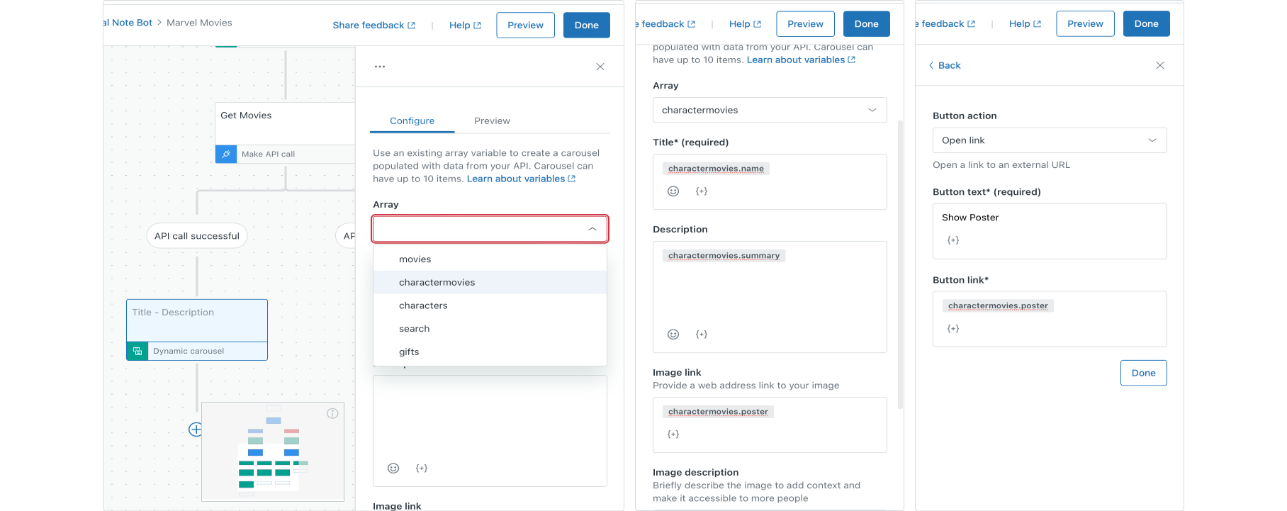 Our new Movies answer correctly shows all available movies in our API. But in our Characters flow we ended with our user choosing a single super hero. It would be nice if we could show only movies starring our hero without the need to create multiple answers. This way we can trigger a single Movies answer in our bot, but have it dynamically show either all movies, or only a filtered set of movies.