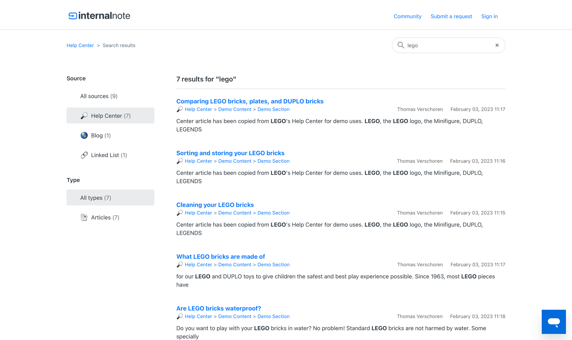 If you search for e.g. LEGO it'll show support articles from the FAQ, an article from this Blog, and a few external links in its results.