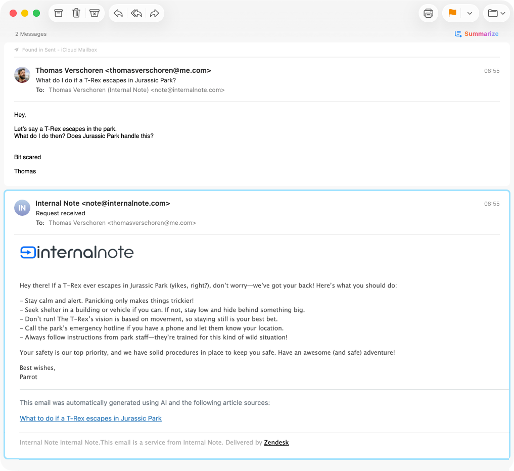 Once enabled the experience for both customers and agents is pretty straightforward. When a customer emails your team they get an email with a response to their inquiry. The email clearly notes it's written by an AI Agent, and even contains the agents' name.