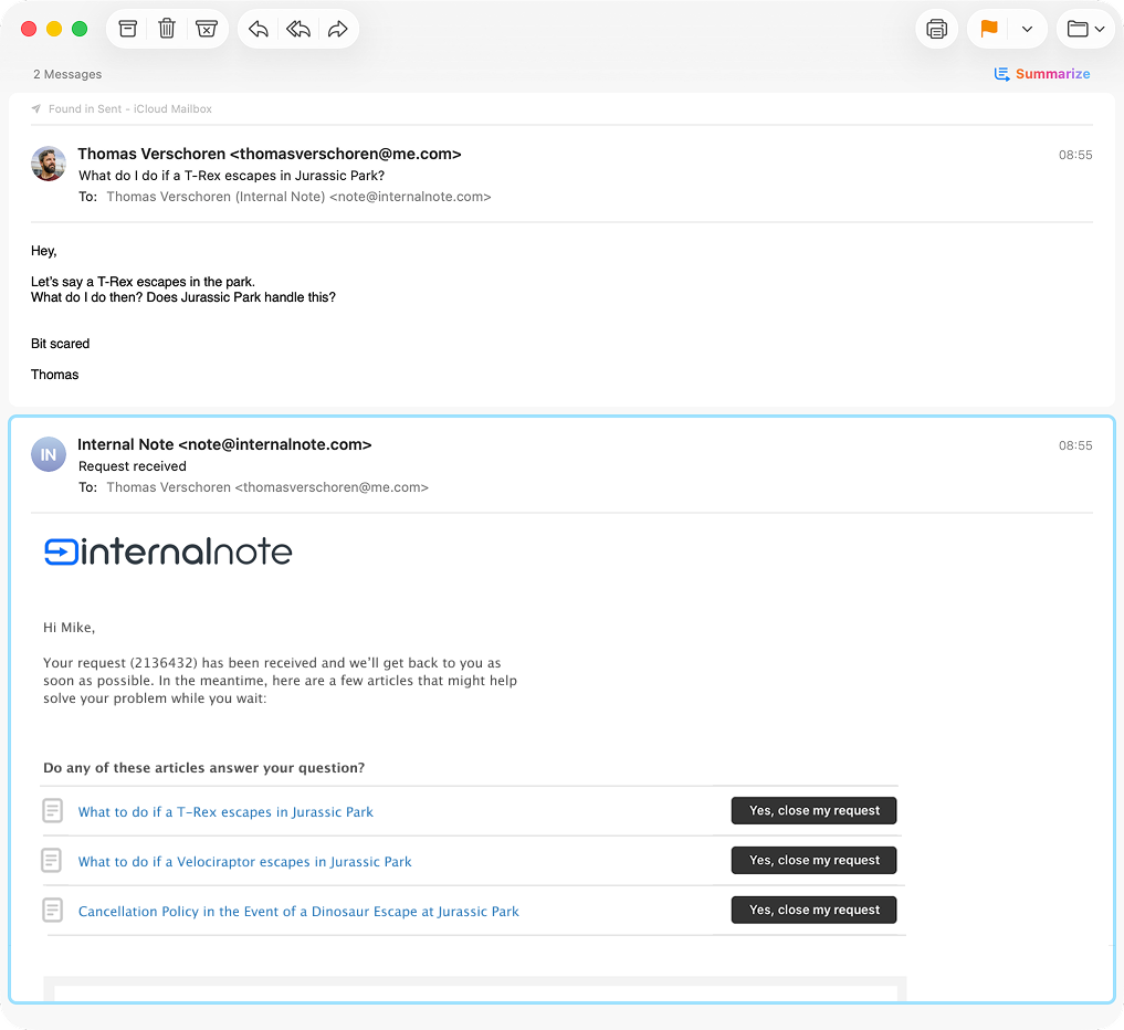 Instead of the customer needing to read an article, they now get a response that explains how they can resolve their inquiry, right from the email. If the solution helps they can either ignore the email and move along with their life. This will trigger an automatic closure via automations, followed with a satisfaction survey.