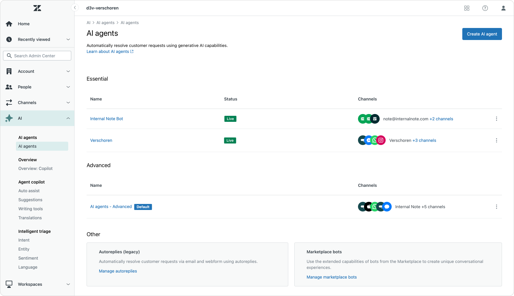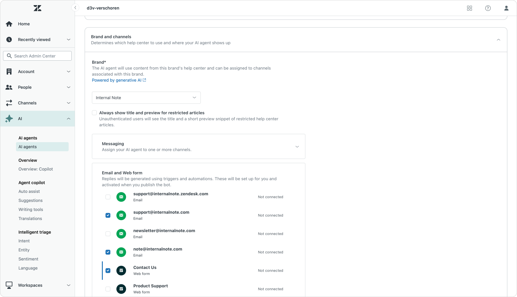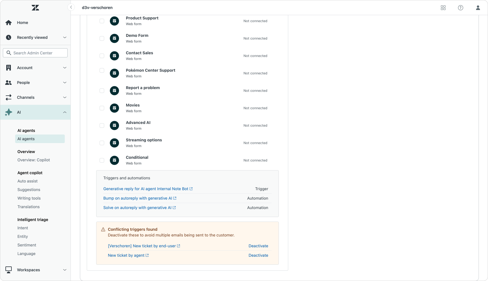 Luckily Zendesk takes these into account. When you enable ticketing channels the system will show a list of conflicting channels. You can open these and either deactivate them, or tweak them to exclude the brands, forms and email addresses you want the AI Agent to handle.
