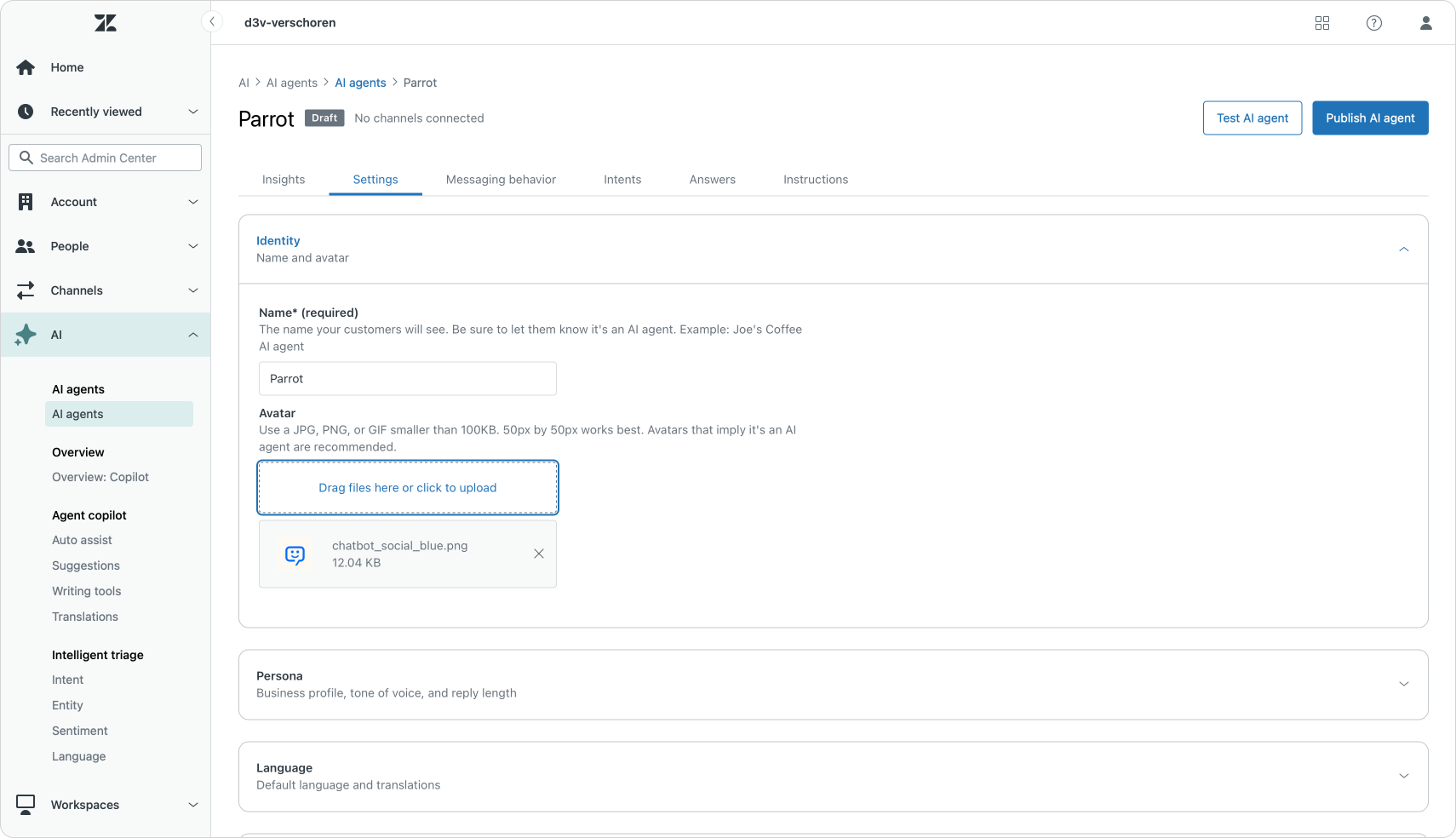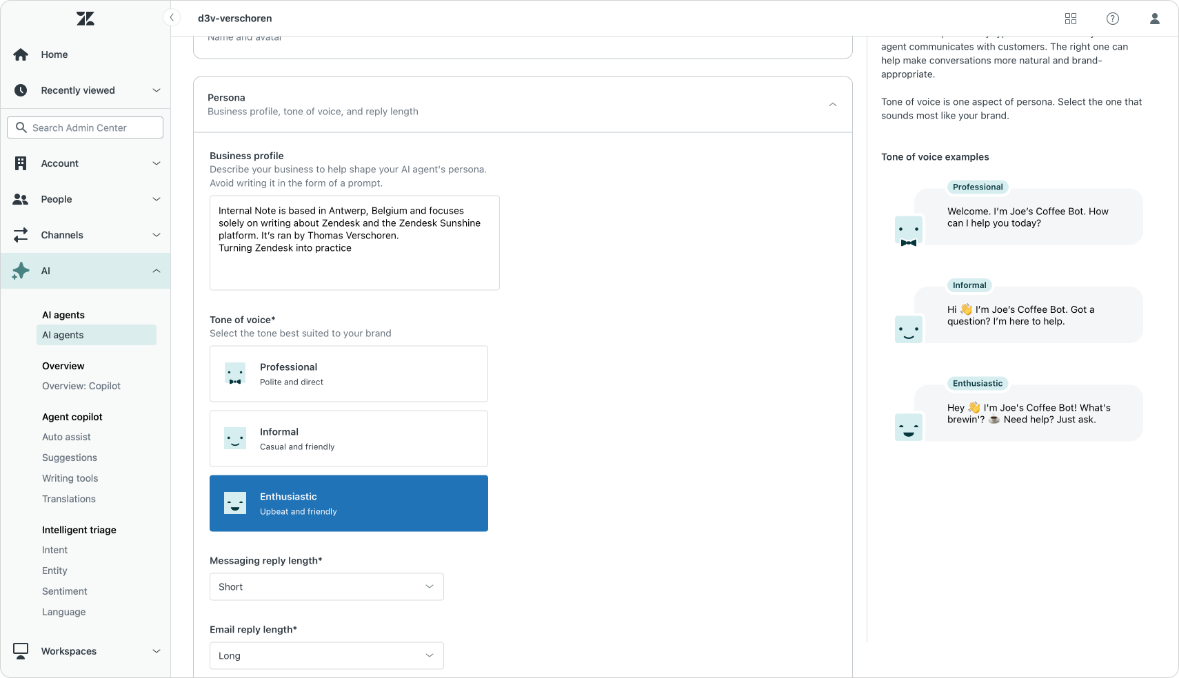 It all starts with configuring your AI Agents' persona. You describe your company, you give your agent a name and avatar and you decide it's tone of voice. These will define how your AI Agent reacts and will influence the way it phrases responses. It will for example understand if it's replying to customers, guests, passengers or employees. Or it will use a very dry or very casual tone of voice.