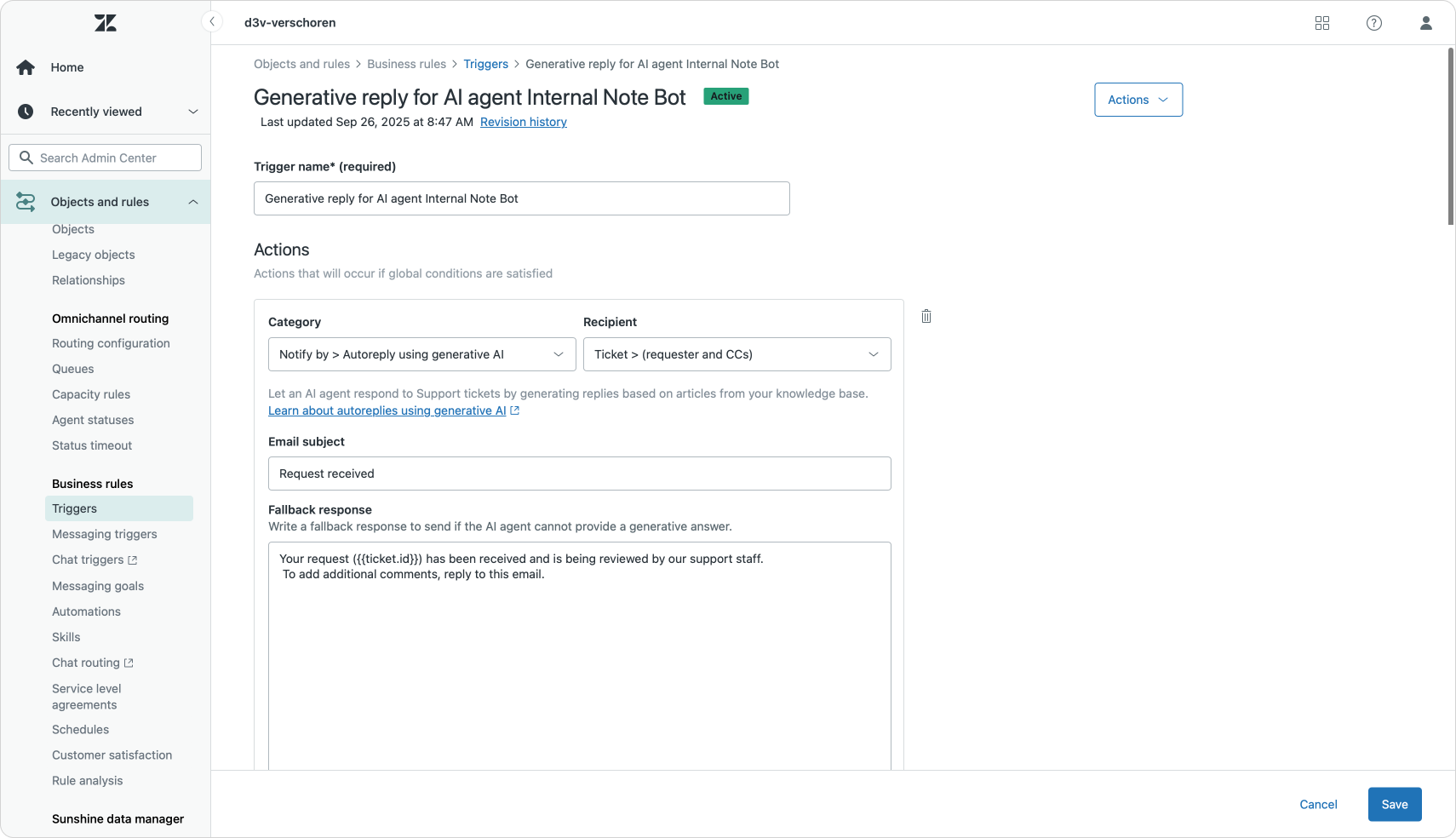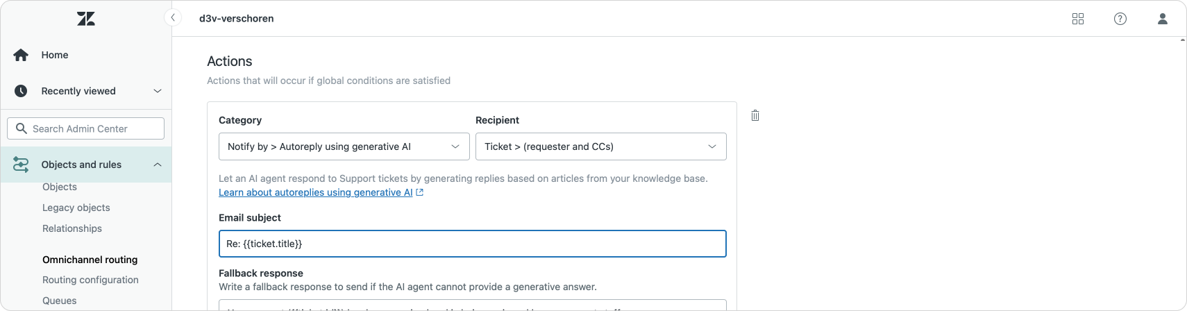 The system will also create a set of new triggers that contain a new "Generative reply" action, as well as two new automations that create a remind and solve automation flow. Customers that get a generative reply will receive a reminder email after a few days. And if they still don't reply we can assume their issue is resolved and the system automatically closes the ticket.