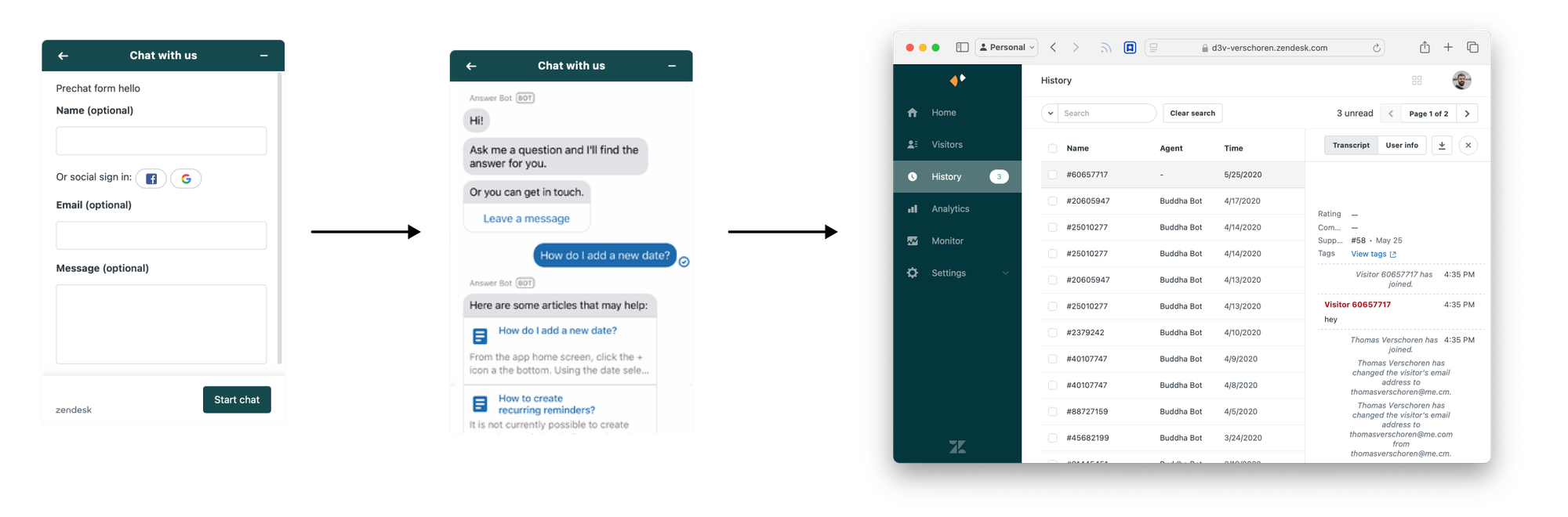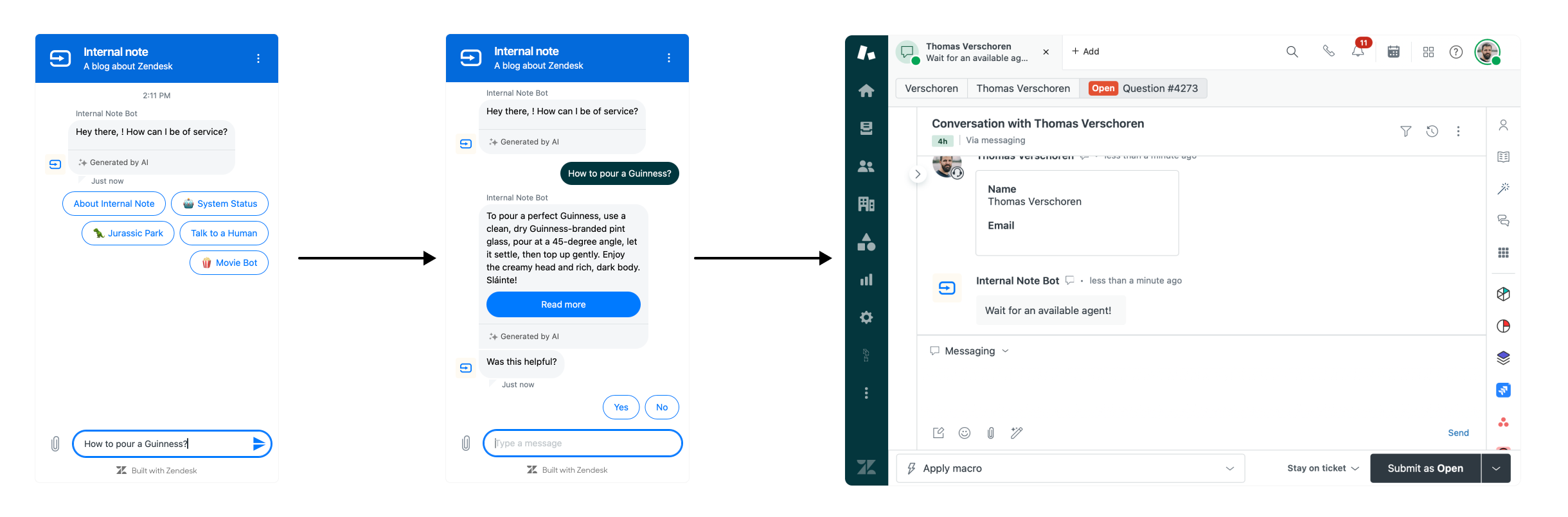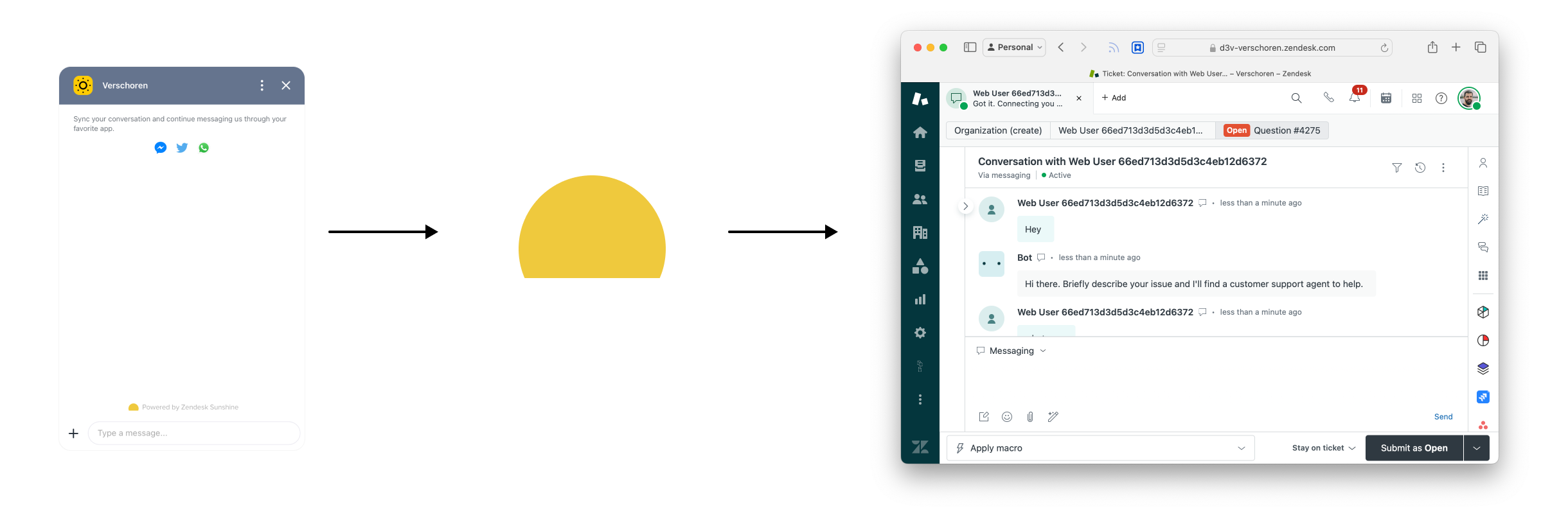A customer opens a web widget and asks their question. That question ends up in Zendesk and an agent replies.