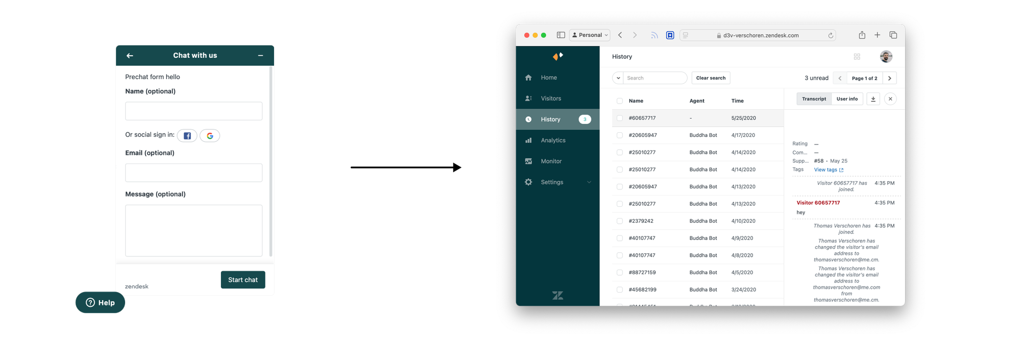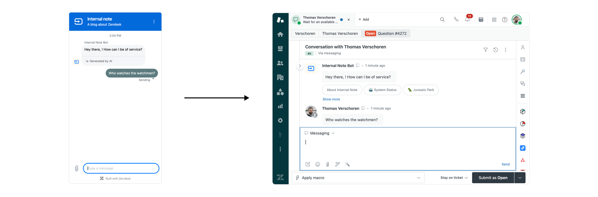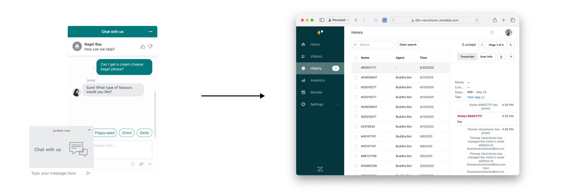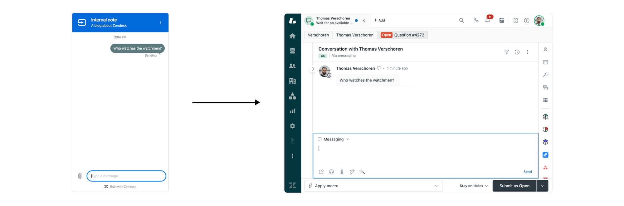 A customer opens a web widget and asks their question. That question ends up in Zendesk and an agent replies.