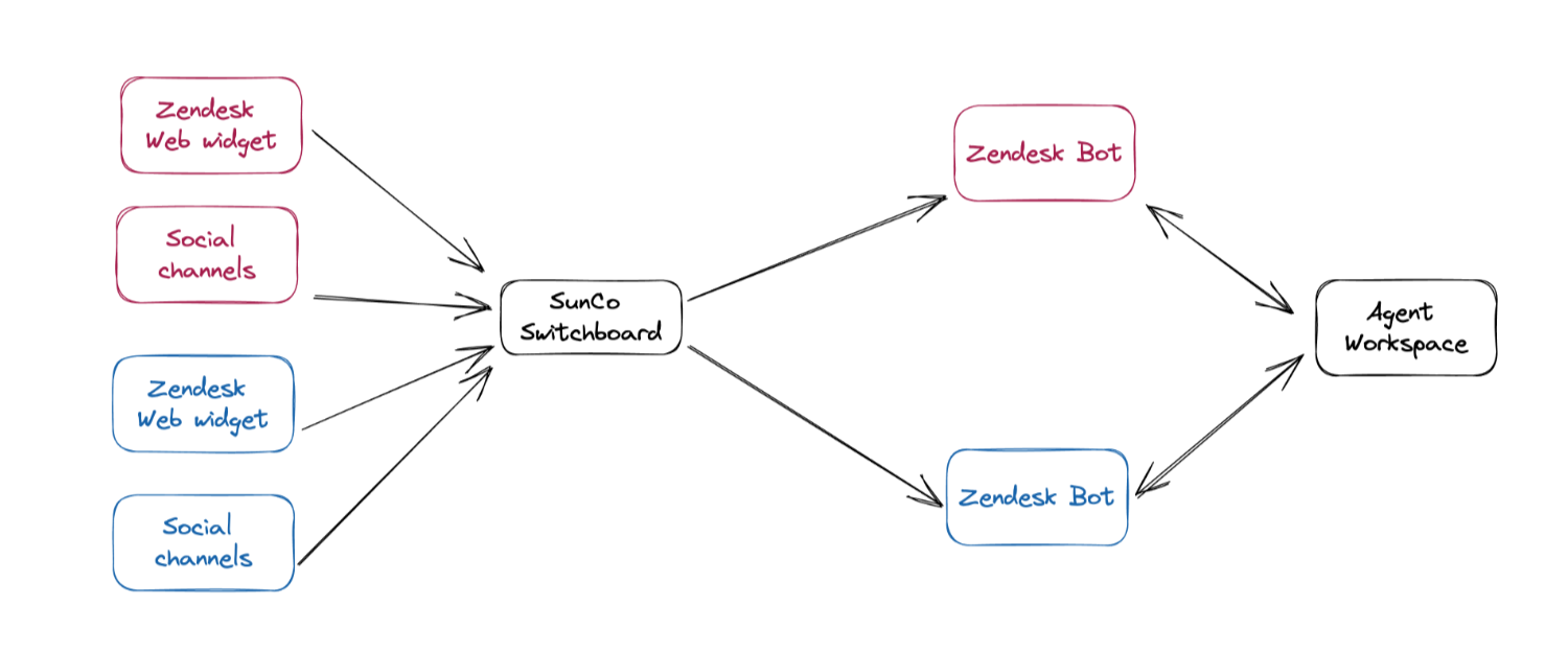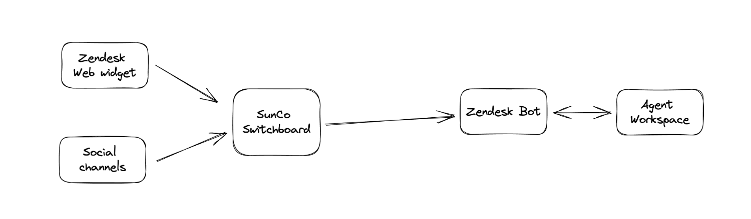 This is the easiest flow. All native Zendesk channels and social platforms are handled by Zendesk automatically, forwarded to the Zendesk bot, and if needed escalated to your agents.