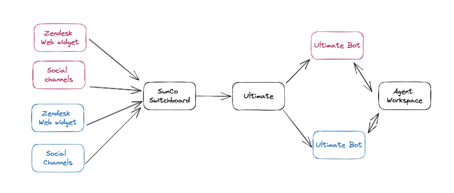 Upon setup we need SunCo credentials to integrate Ultimate, upon which Ultimate takes over and routes all available channels to itself, removing the link to the Zendesk bots. You'll find Ultimate in the SunCo integrations as ultimateaibot