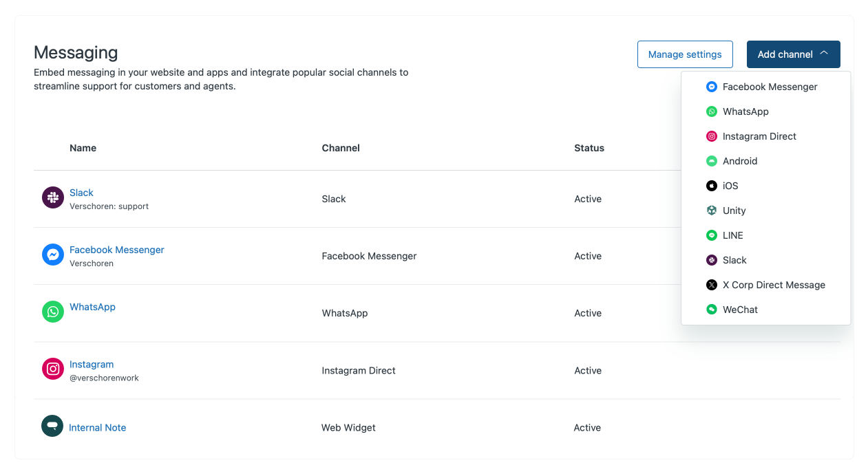 A channel is a unique way via which the customer contacts your team. It's a combination of a platform and brand. Eg. The Web Widget for brand A, or the Facebook Page for brand B, or the Instagram Feed of brand C.
