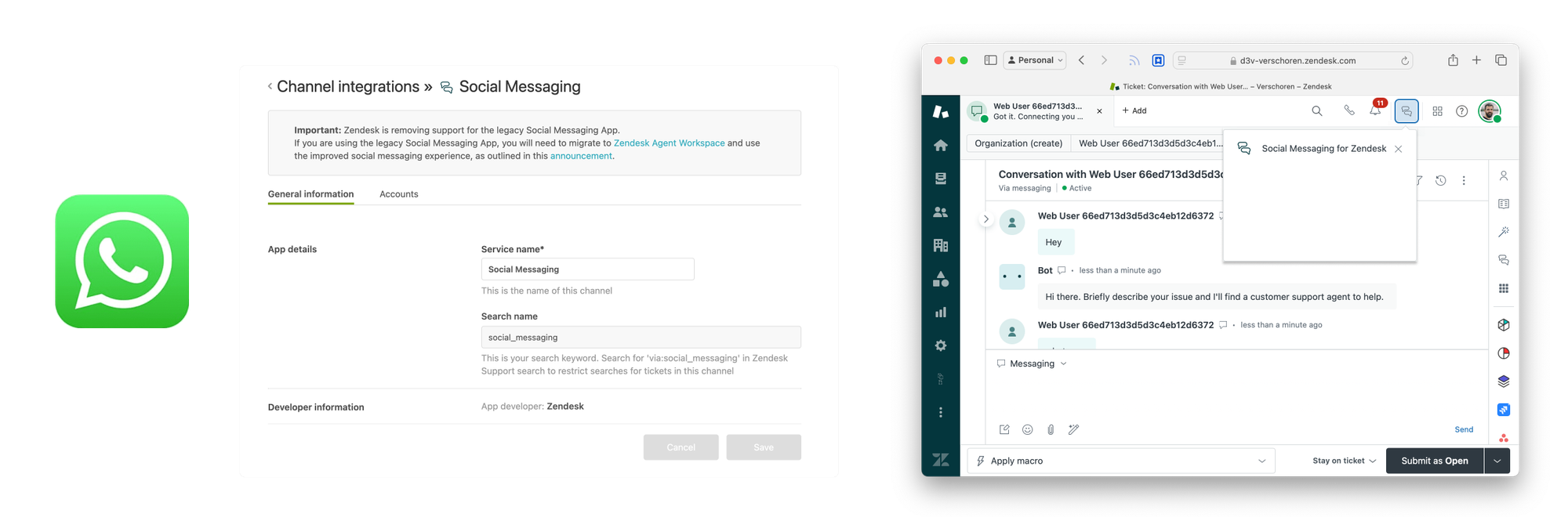 In its first iteration Zendesk quickly patched and integrated WhatsApp, Facebook Messaging and Twitter DMs into their platform by building a Marketplace app called Social Messaging. Underneath this marketplace app, they routed all connected channels to Smooch and made sure that each channel would end up at the right customers' instance, and assigned to the right brand.
