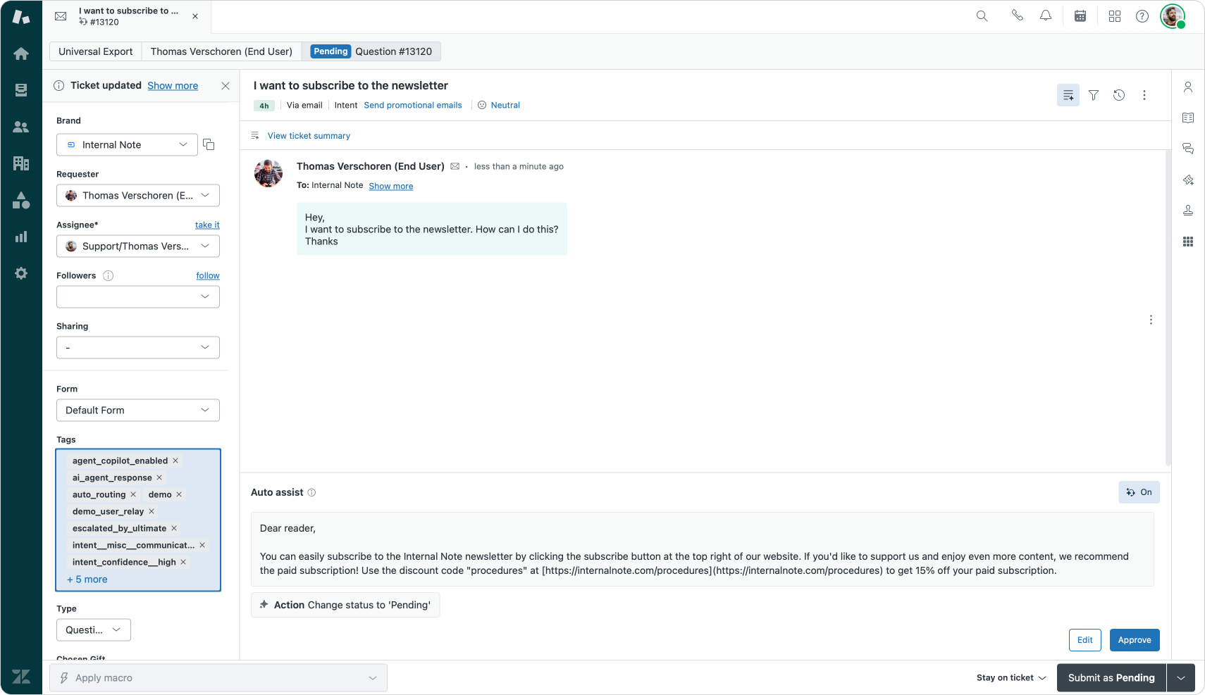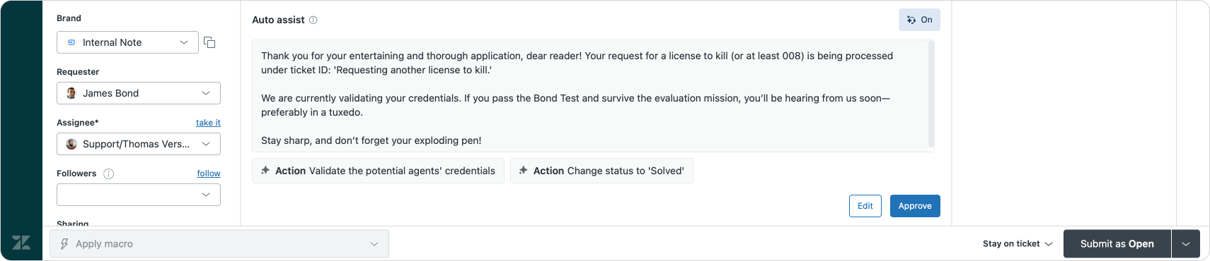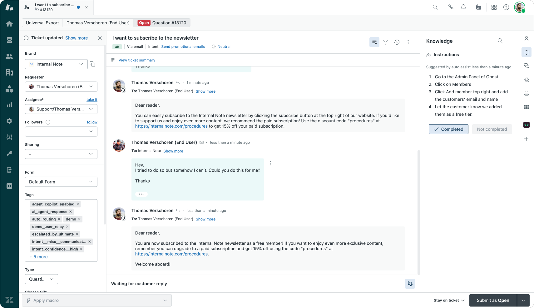 Secondly, they are great to onboard new team members. Agent Copilot already takes away the burden of learning all processes before diving into tickets. By offering replies and next actions, Agent Copilot guides new team members through processes, showing them how things are done, while offering them simple ways to intervene and add internal notes to request help form a team lead.