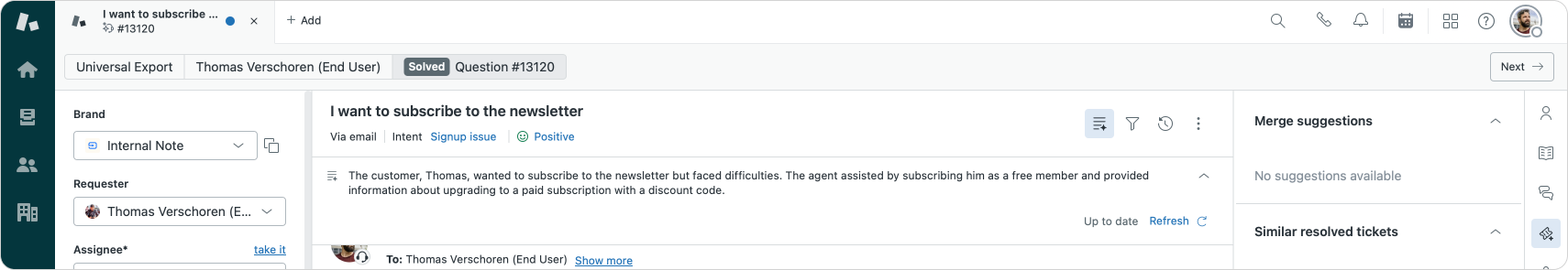 It then surfaces a summary, similar tickets, merge suggestions, and full customer context—giving agents all the information they need before they even read the conversation.