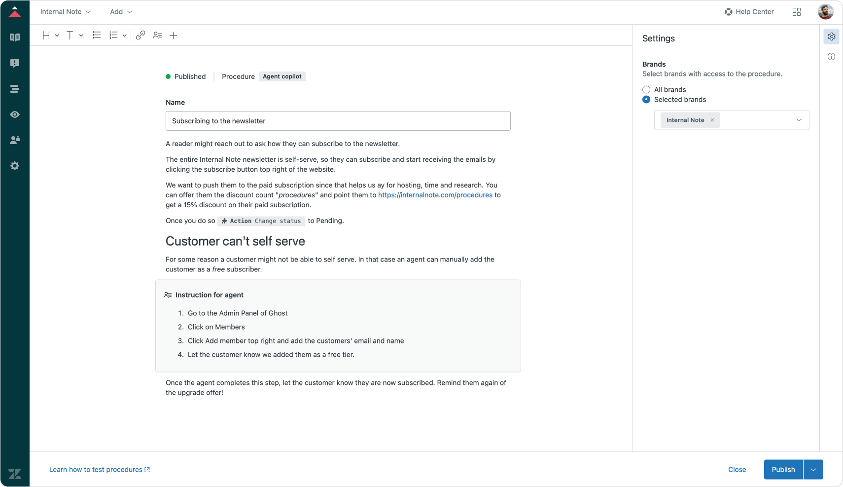 Adding instructions is done via the new Add instructions option in the procedure editor. When clicked, a block is added to your procedure where you can write down the steps for an agent to take.
