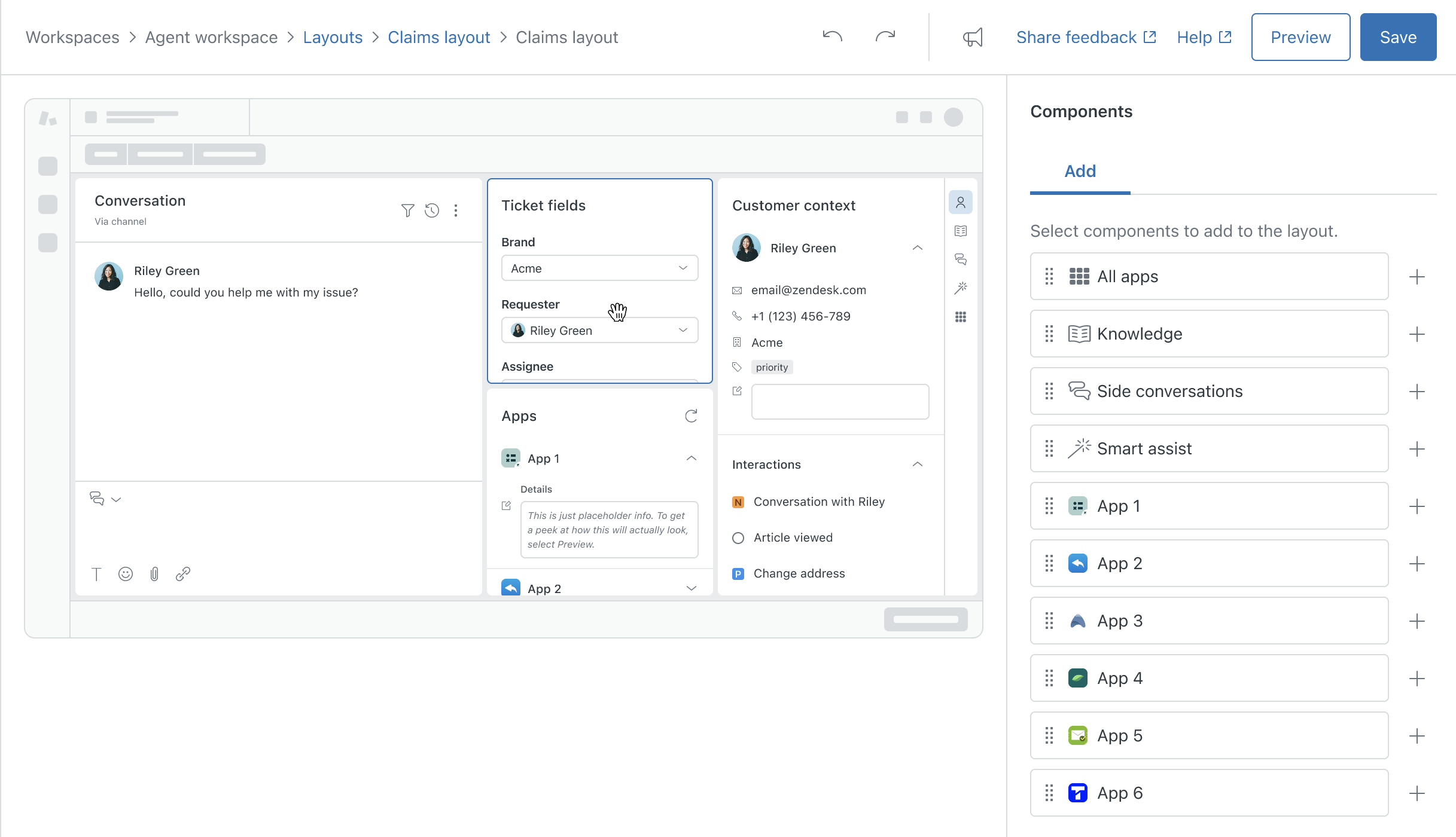 After adding flexible sidebar apps, resizing the ticket field panel and moving a lot of elements around this last year, Layout Builder will, for the first time, allow you to really move big blocks around. Apps can alway be visibler, you can hide/show ticket fields, or even keep Customer Context and Side Conversations side by side for more context.