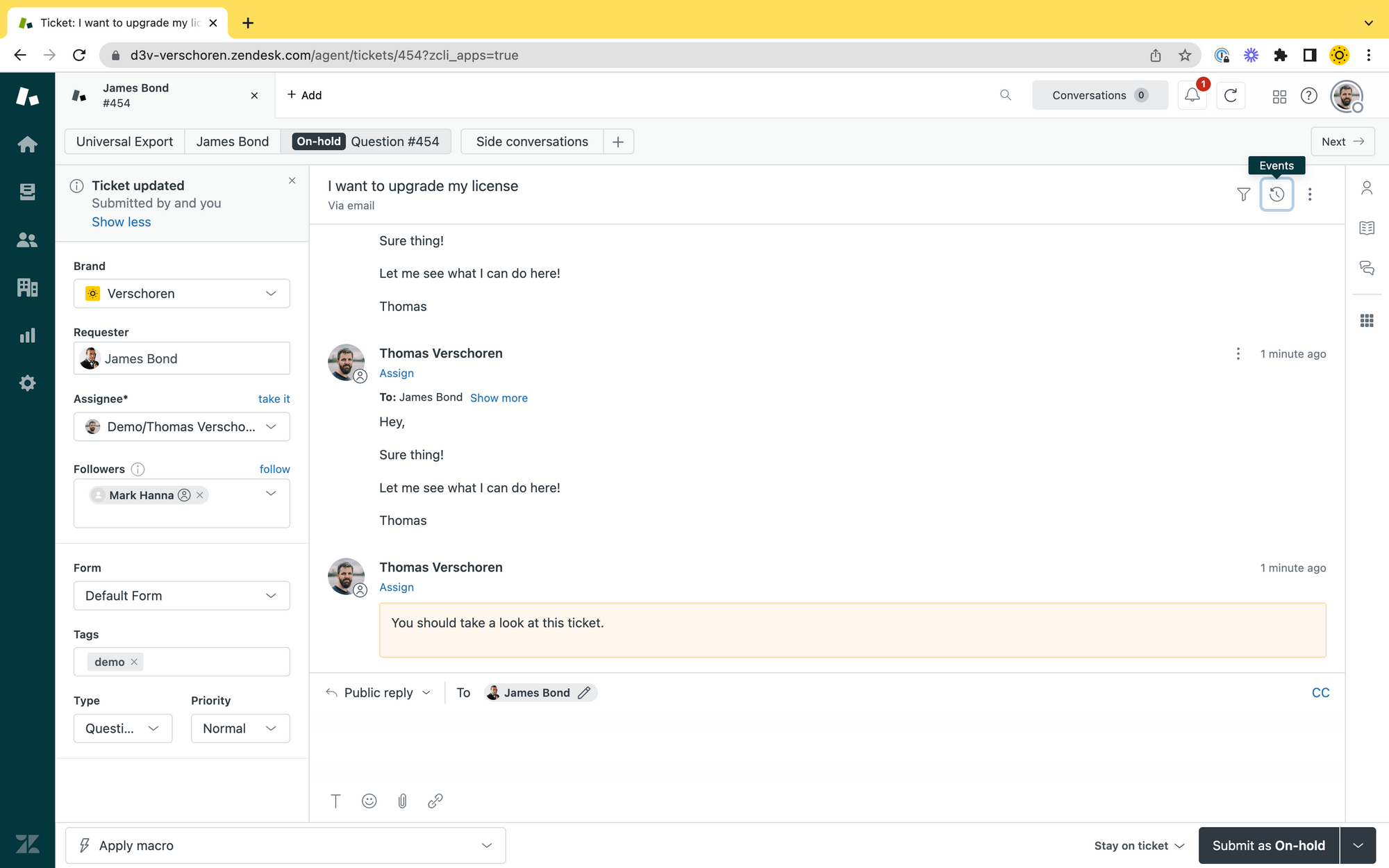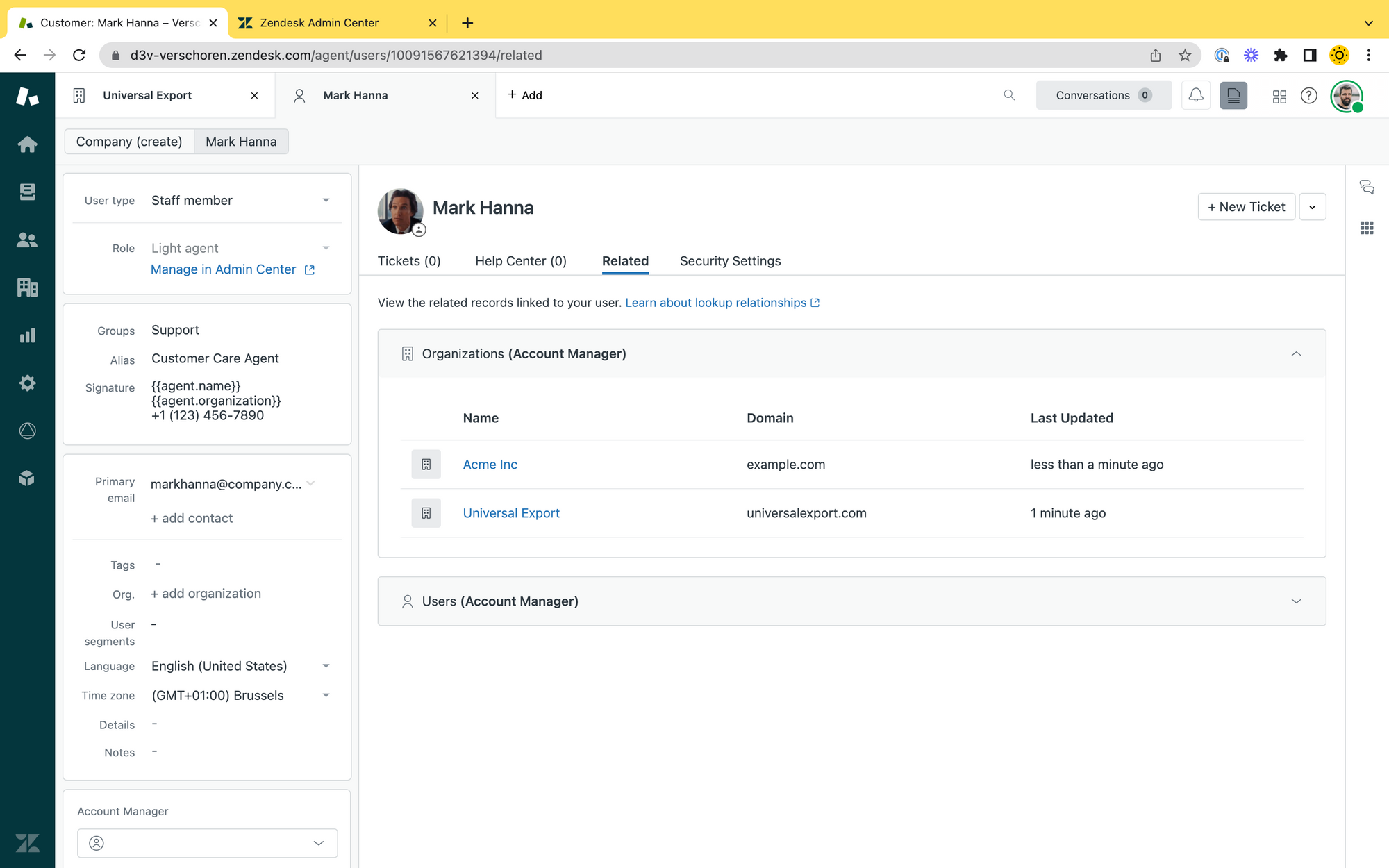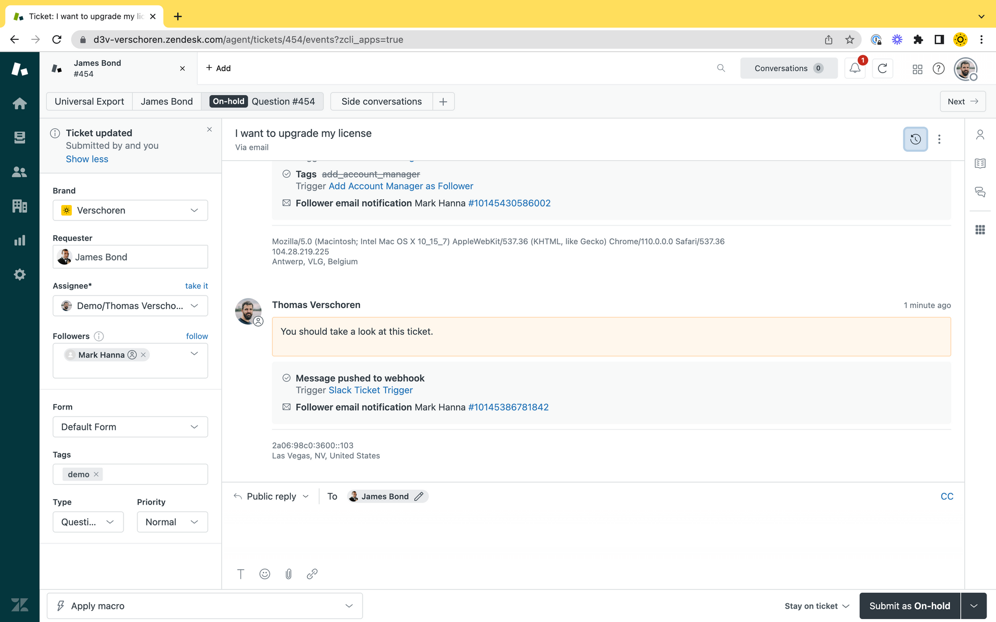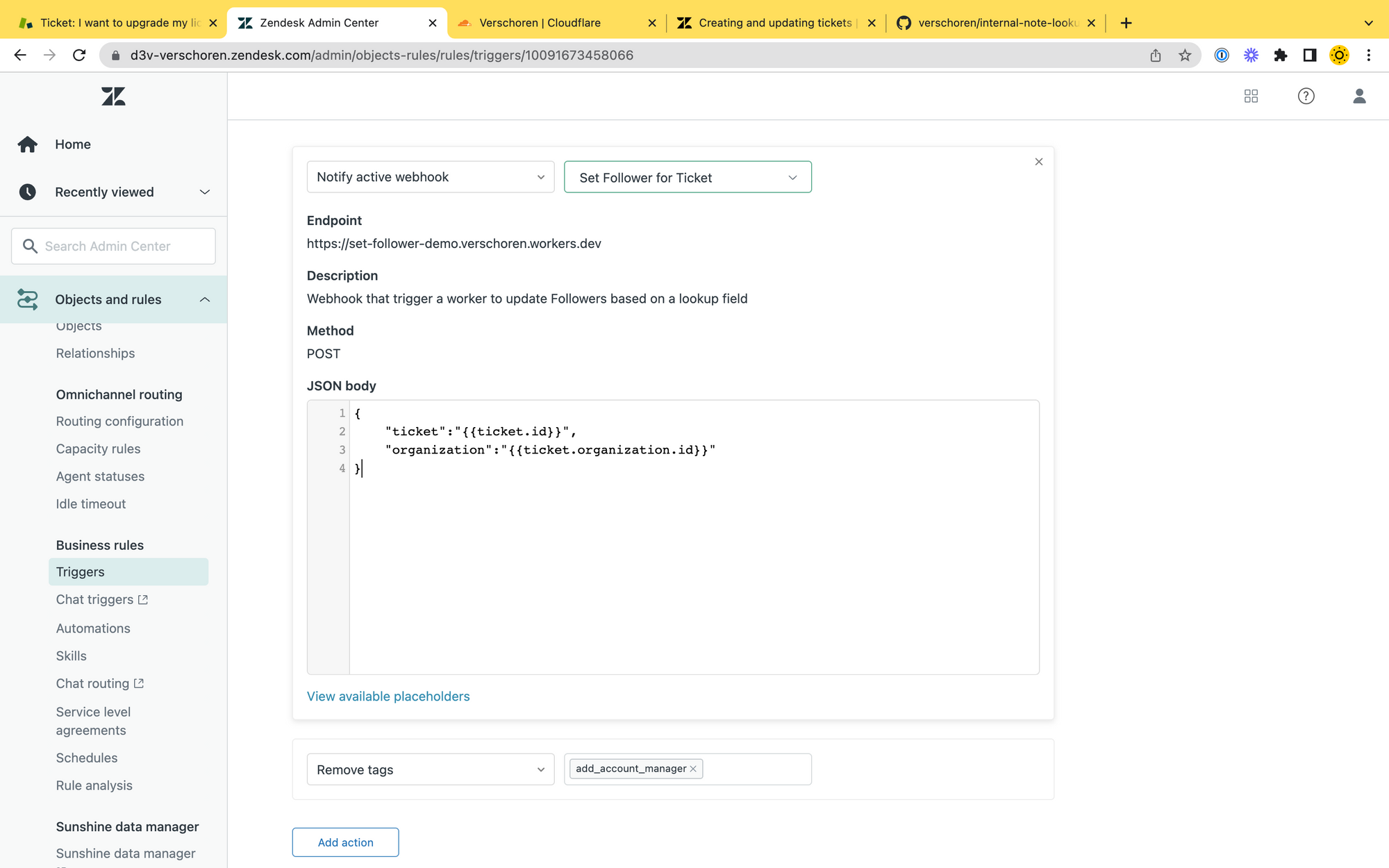 account_managervalue in theorganization_fieldsto retrieve its ID and we update the ticket accordingly to add a Follower. - We add an internal note to the ticket so the Account Manager immediately gets notified.