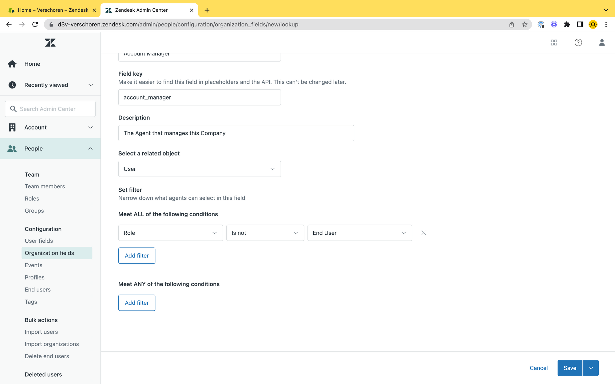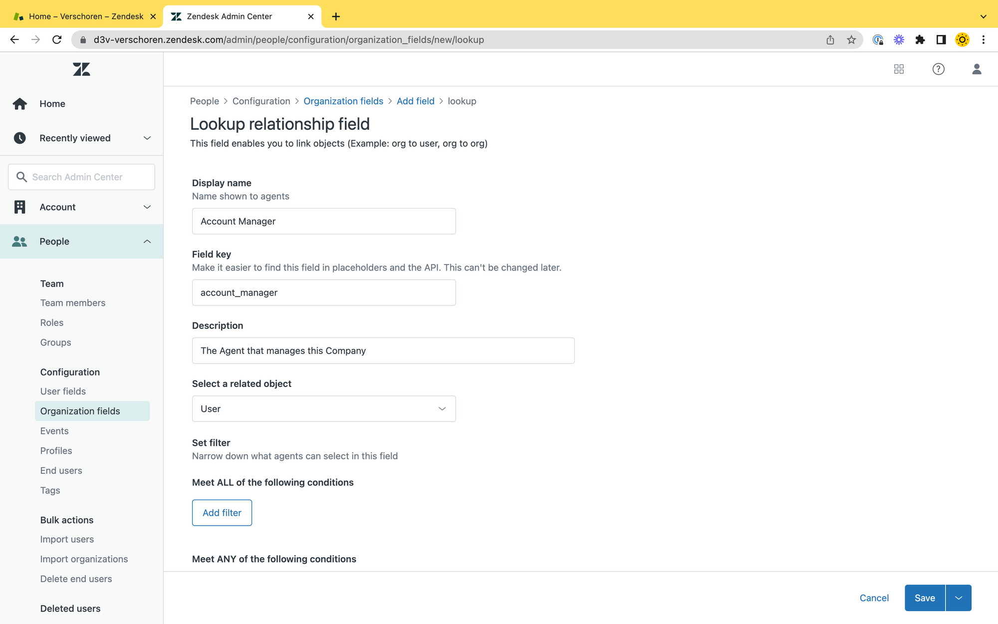The first step of this flow is the creation of the Lookup Field. Since we want to store an Account Manager on our Organisation we need to create a new Organisation Field.