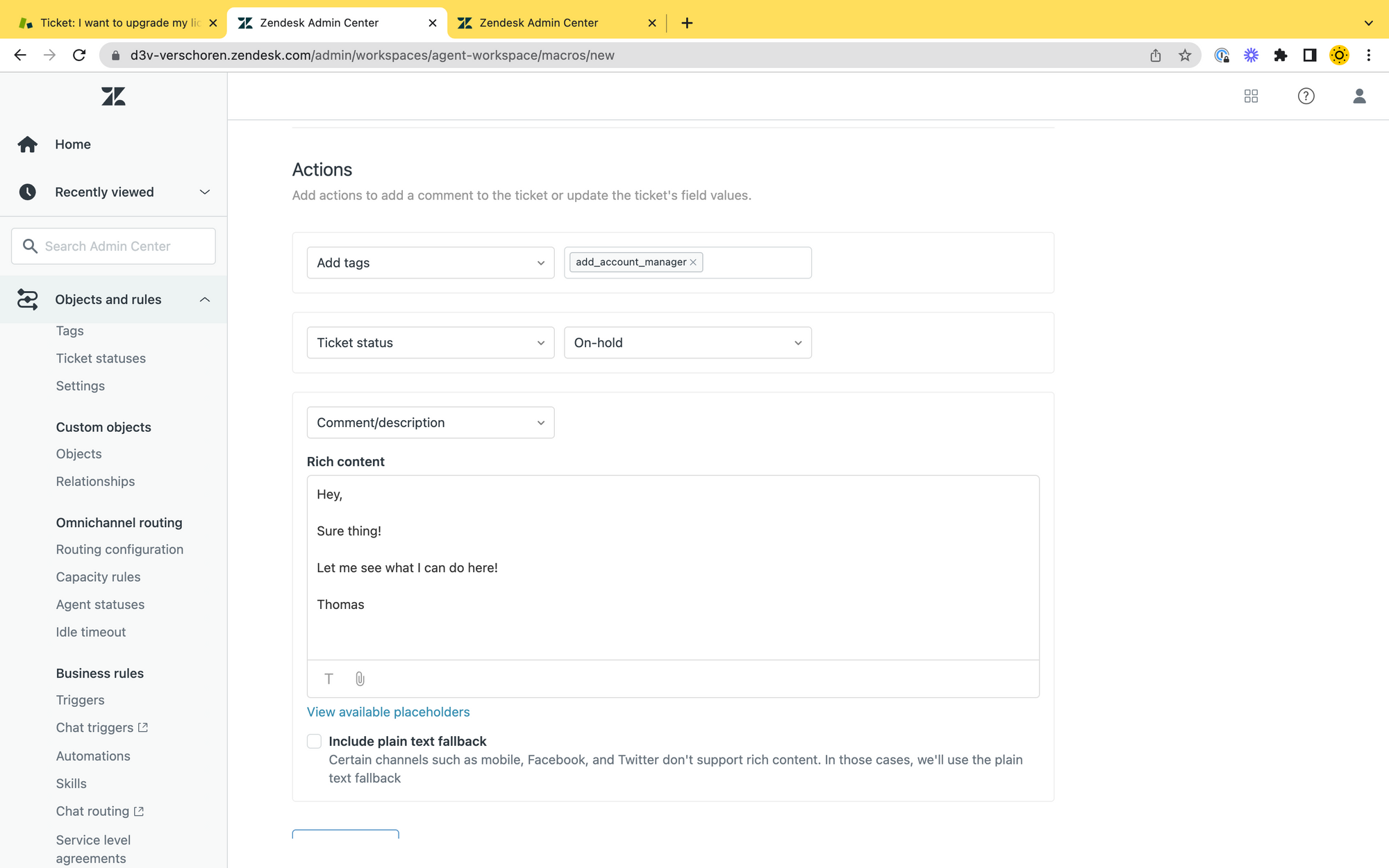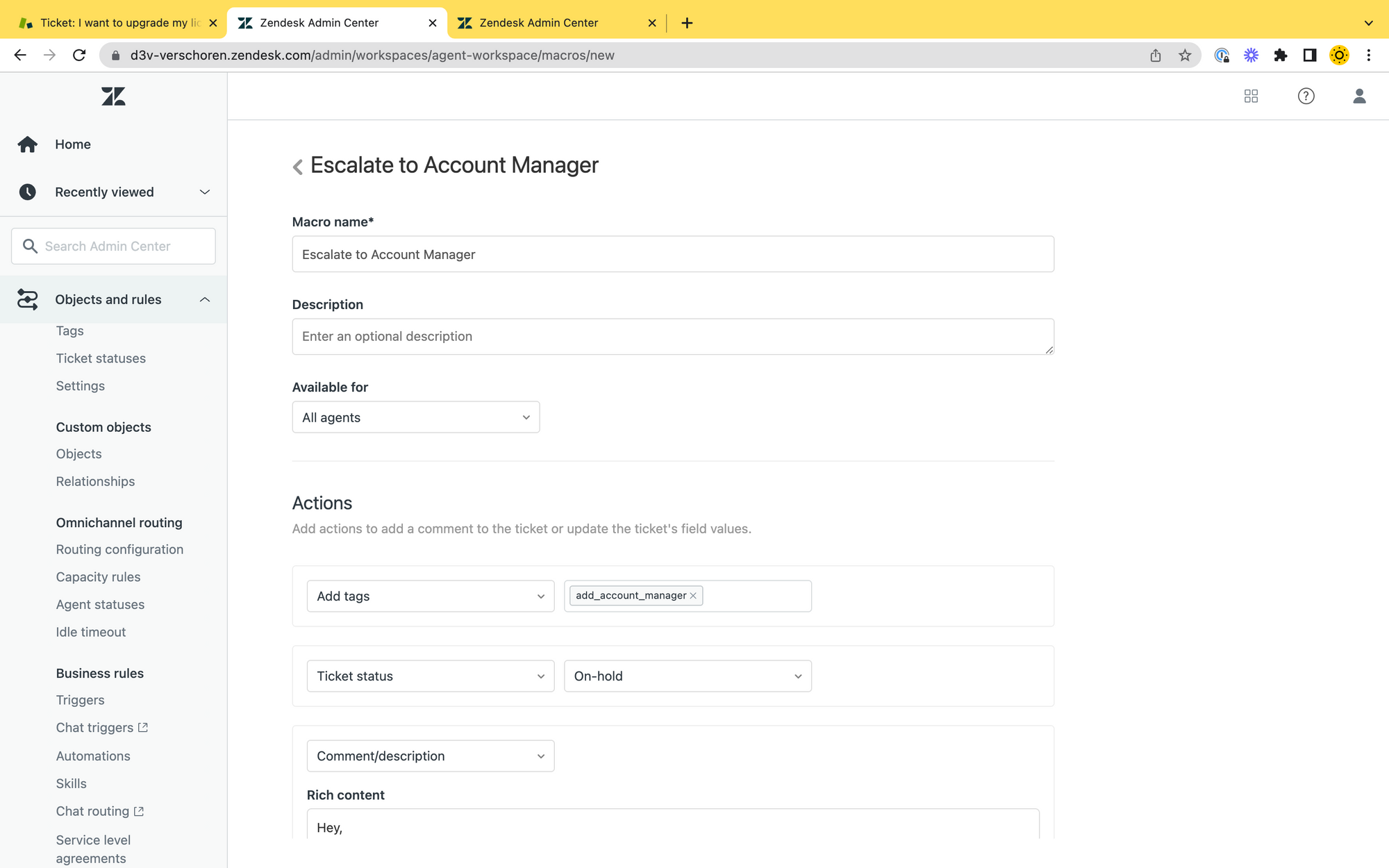 The Macro is pretty straight forward. Just make sure it adds a Tag add_account_manager to the ticket. In my case I also set the ticket to On Hold and a Public Comment to the customer.