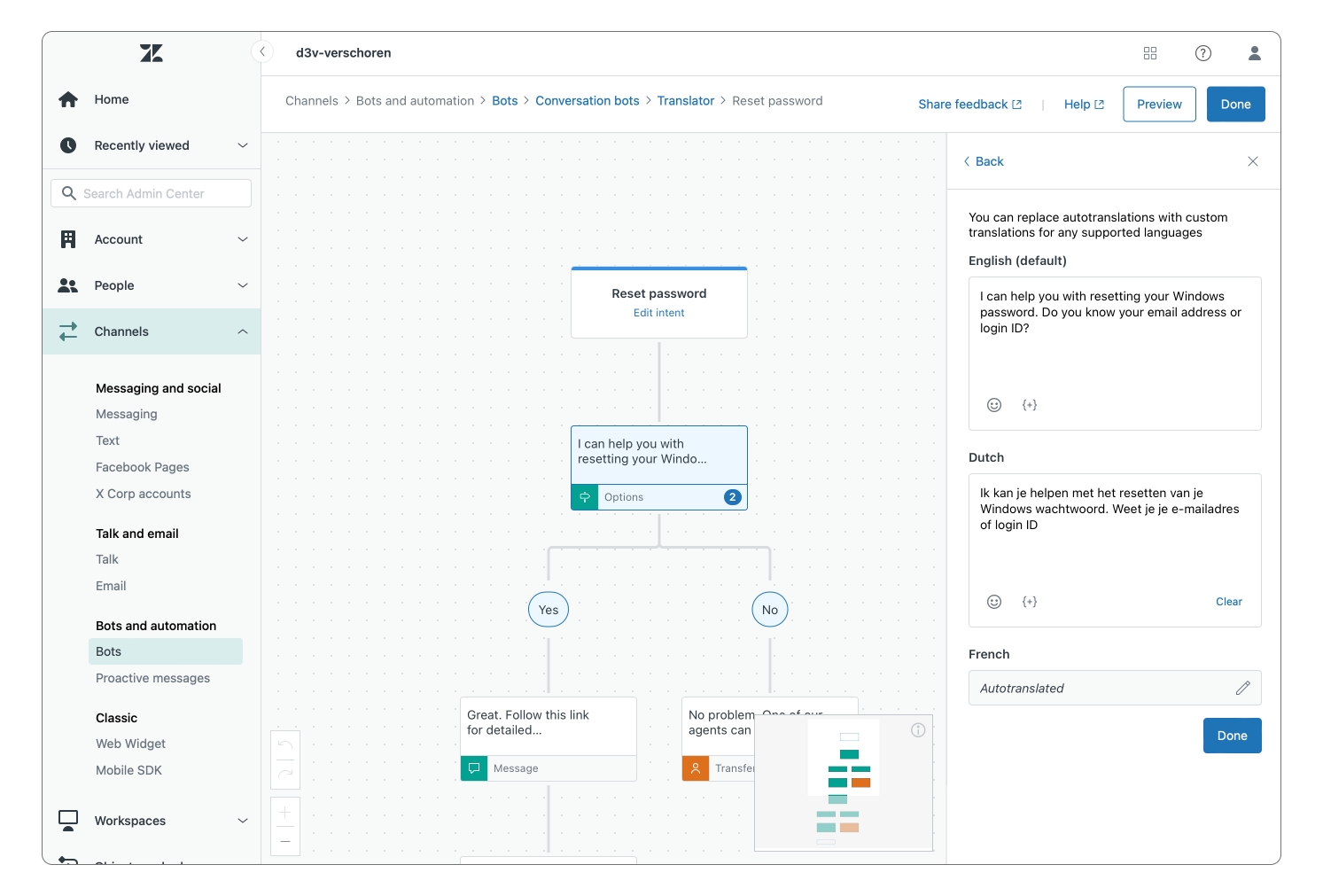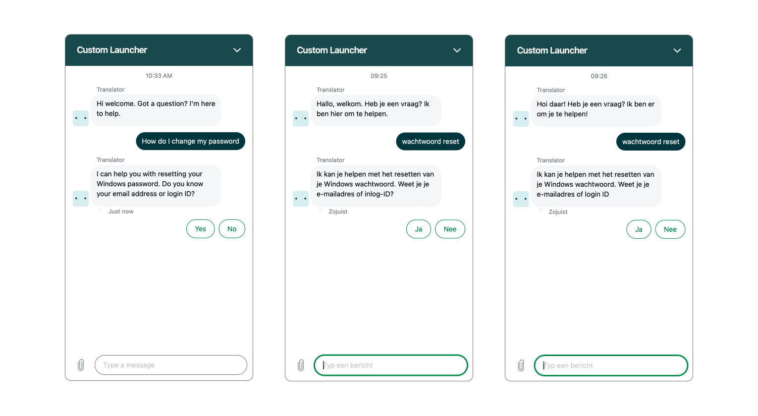 This becomes even more powerful when we dive into custom answers. These flows often contain very specific steps, and interface buttons or product names might be different in specific countries or languages. For example, in the flow below the second screenshot shows an automatically translated response of our reset password flow. The reply contains a rather clumsy inlog-ID translation for the English login ID.