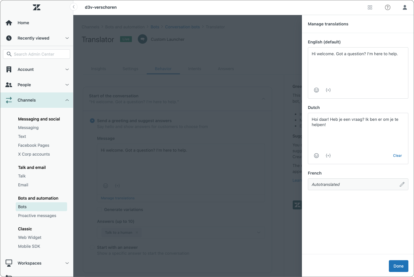 The new custom translations for the Zendesk Bot make it possible to combine automatic translations for all your flows and answers, while making sure that specific replies or words do not lose their context in a bad translations.