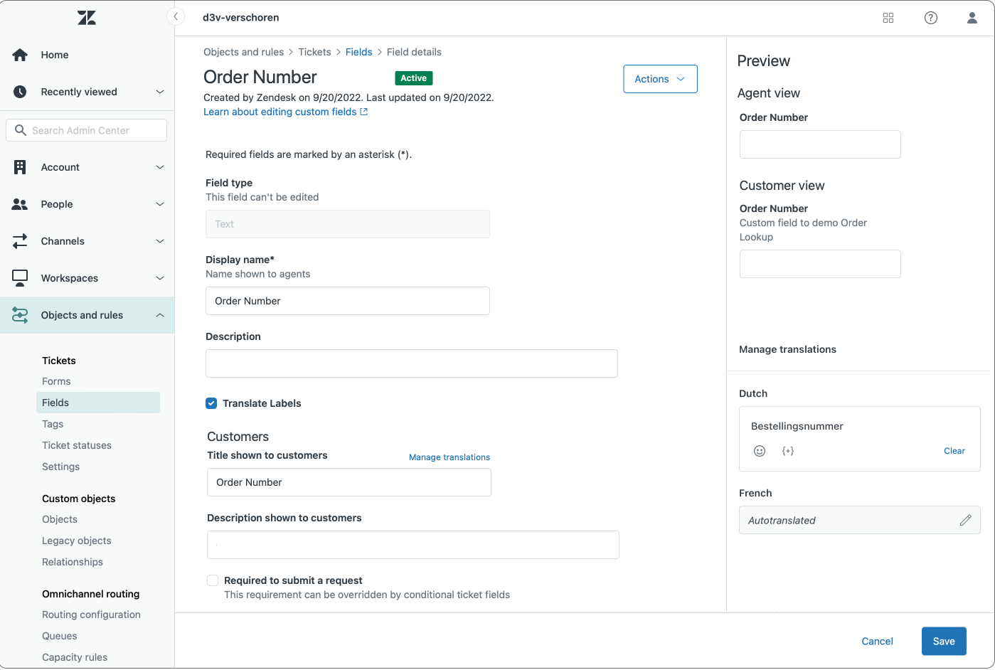 Take a look at the layout below: we've got the ticket field editor in Admin Center, but added the translation features from the Zendesk Bot. You'd be able to auto-translate dropdown options and labels, or overwrite a specific labels' value with a custom translation. Would be nice to have no?