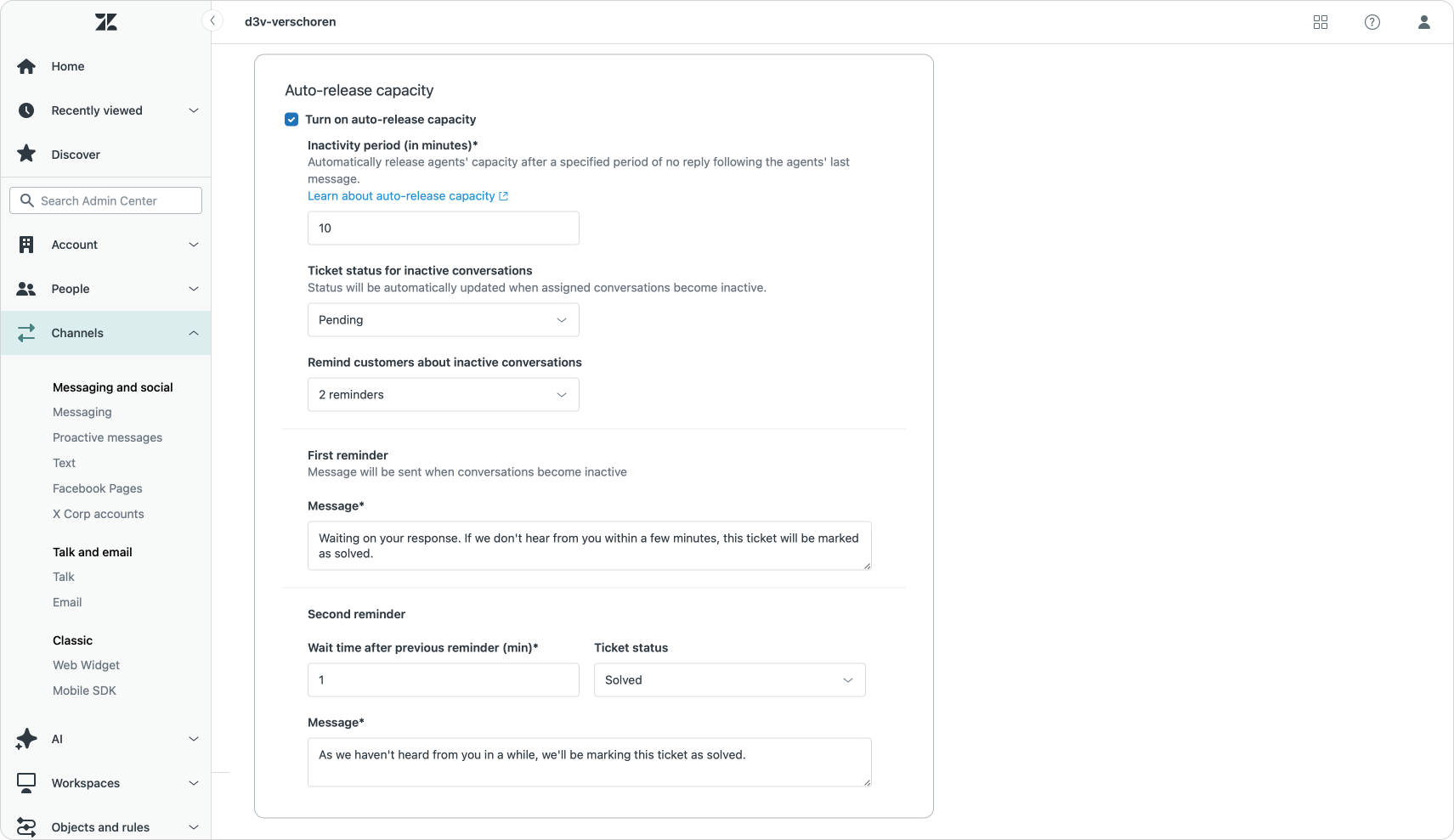Where wait time messages are setup as part of the Web Widget settings, Reminders are setup as part of the main Messaging settings. This has the benefit that you don't need to setup reminders for each channel one at a time. But also comes with the downside that the reminders are active for all channels, regardless of channel type (or customer type).