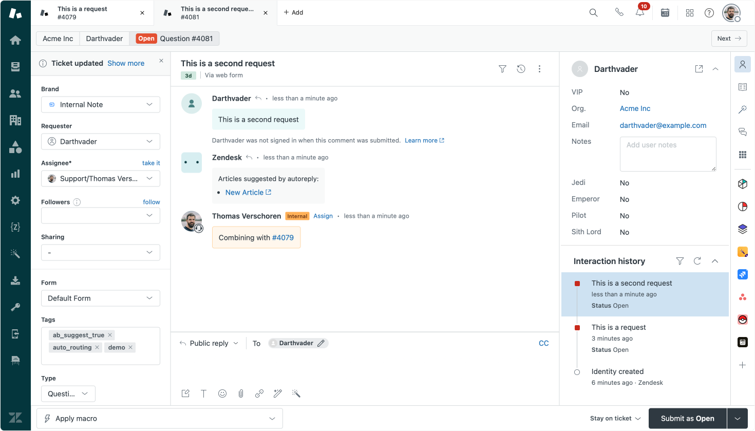 Earlier this month at the Zendesk Partner Days a conversation came up about the best way to merge tickets made by the same end-user. It's a scenario that happens a lot. A customer has an urgent question and they shoot an email, web form and social message to every support channel they can find.