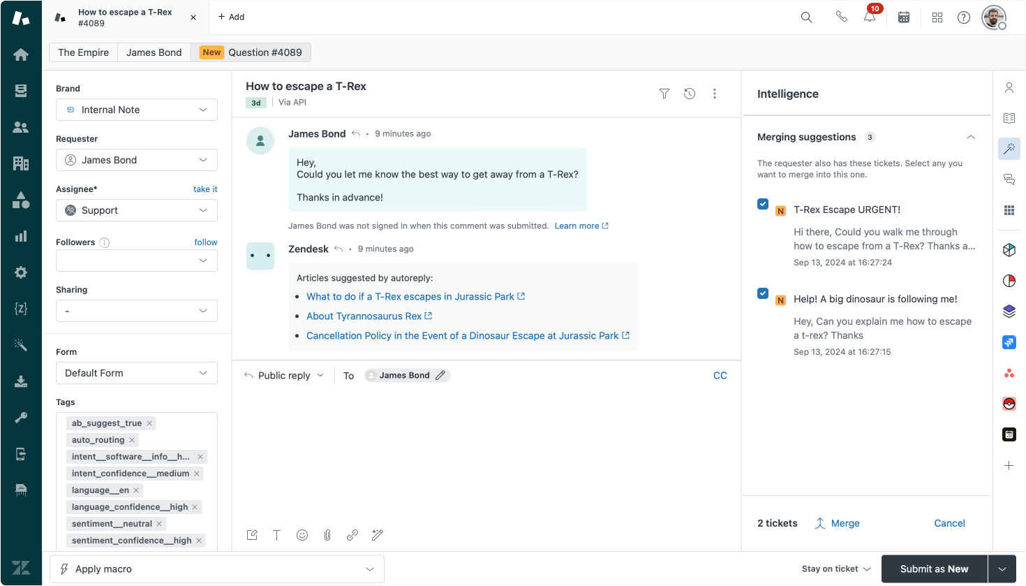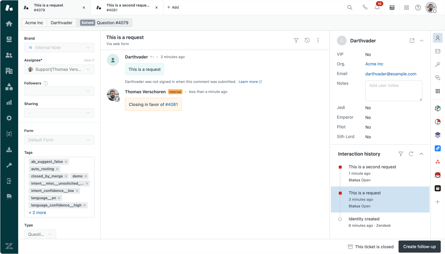 Internal Note wouldn't be in Internal Note if an article didn't include some over the top hack of existing Zendesk features 😅. One of the scenarios we discussed at the Partner Days was a way to automatically merge all active tickets of the same requester, regardless of their content.