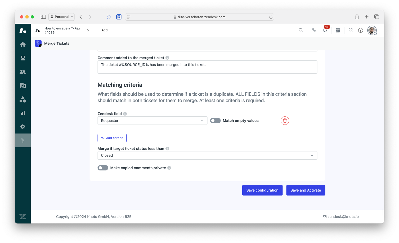 Naturally, the approach above is crude. If a customer emails about different topics we still merge tickets. You can prevent this by leveraging more conditions in your triggers. For example, if you have Advanced AI you could only merge tickets with similar intents. Or you could set an automation that, if a ticket is older than a week, you set the Latest Ticket value to blank so that our trigger doesn't run,...